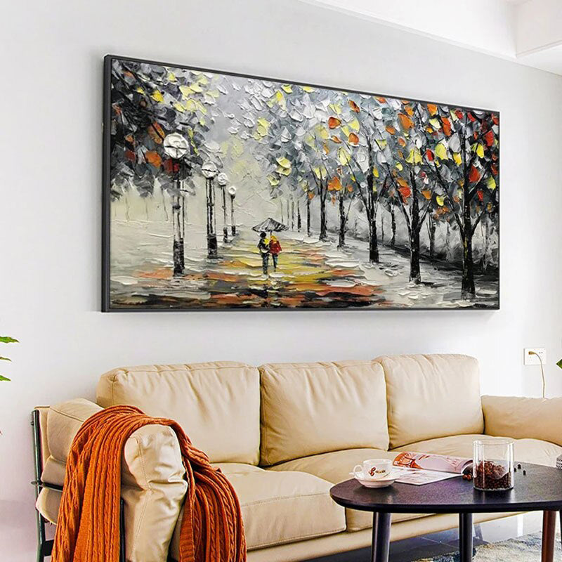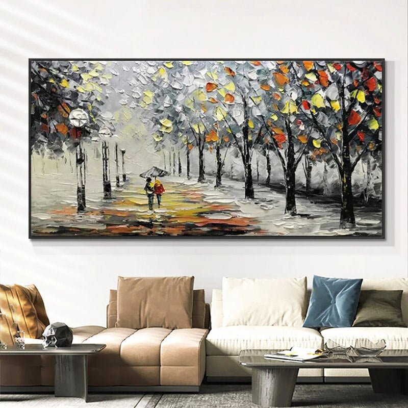 Autumn Avenue captures the romance of fall with every brushstroke. The vibrant leaves, glowing lights, and quiet figures strolling beneath umbrellas create a serene scene. This painting adds warmth and charm to any space, making every day feel like a crisp autumn walk through nature’s golden colors!