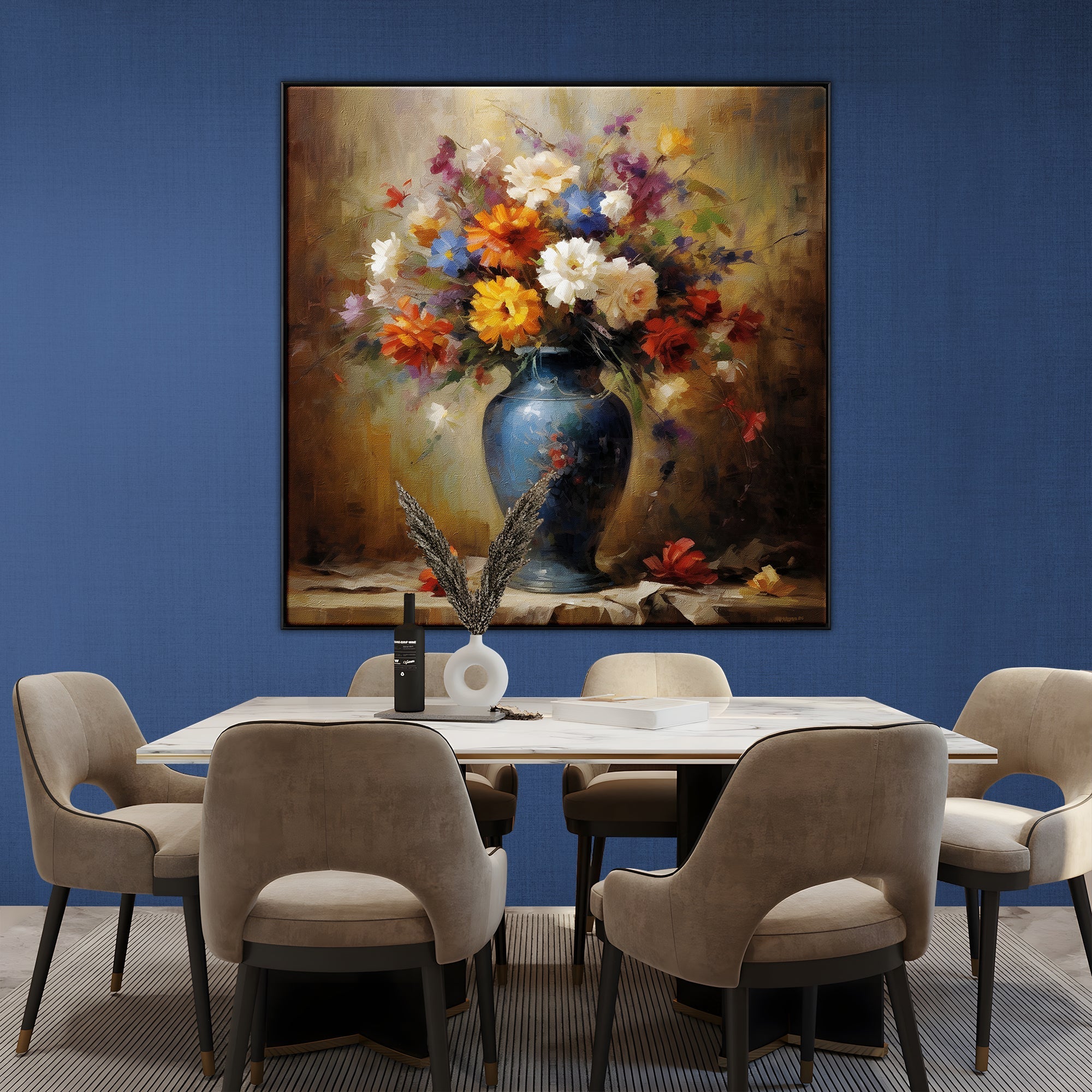 A stunning bouquet of flowers captures the essence of Autumn, inviting you to embrace the warmth of nature's embrace. With a realism-style and vivid colors, this piece adds something melancholicy beautiful to every space.