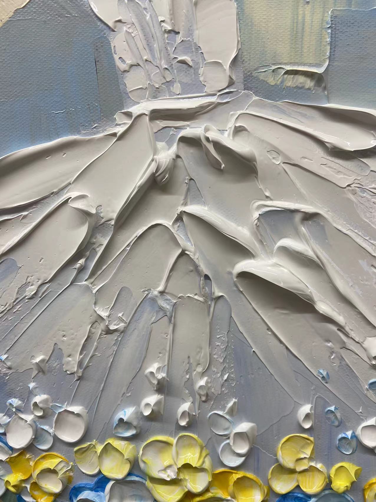 This bewildering ballerina balances beautifully! The mosaic-style background contrasts impressively with the bubbly yellow and blue bubbles that extend her majestic white dress. Ballet, dedication to art, style and perseverance, summarized in one eye-catching portrait!