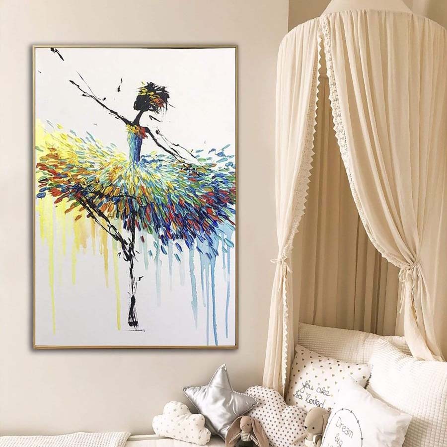 Ballerina Gene pirouettes onto your wall with a burst of color and grace. This vibrant piece captures the essence of dance in every brushstroke, making it a perfect fit for those who appreciate the beauty of movement and elegance.