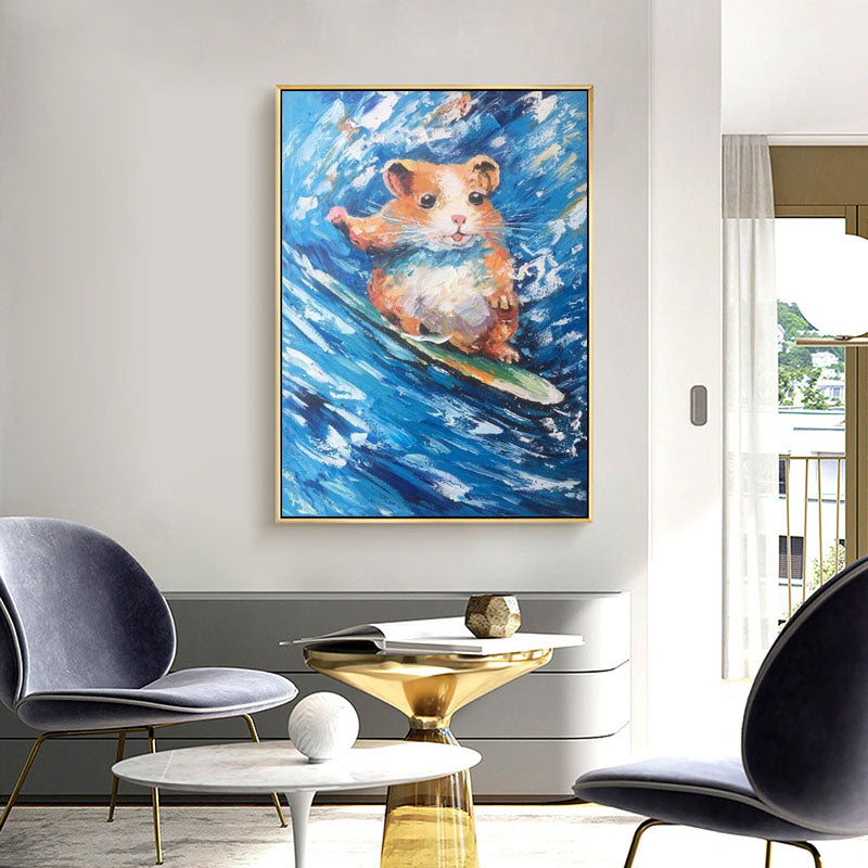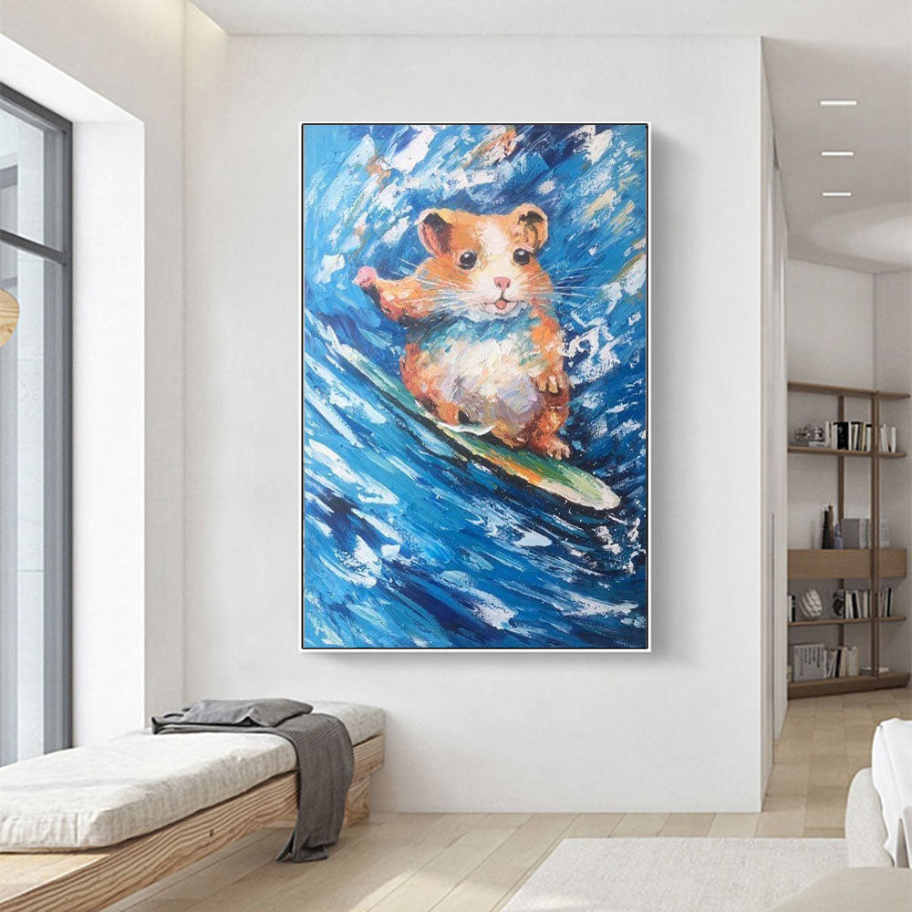 Bubbles the Hamster is here to surf into your heart! This playful painting features a brave hamster on a surfboard, capturing the joy and excitement of a perfect wave. Ideal for adding a splash of character to any room.