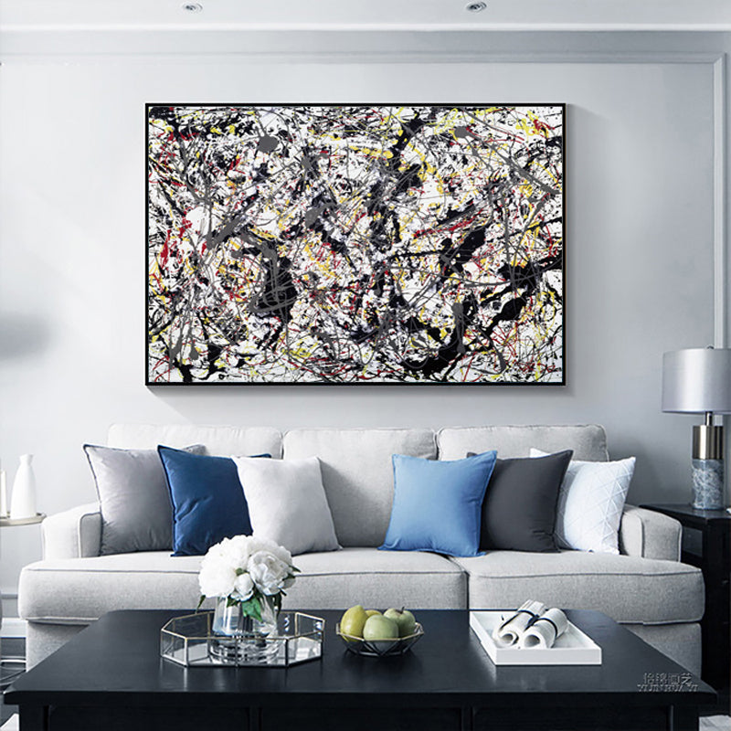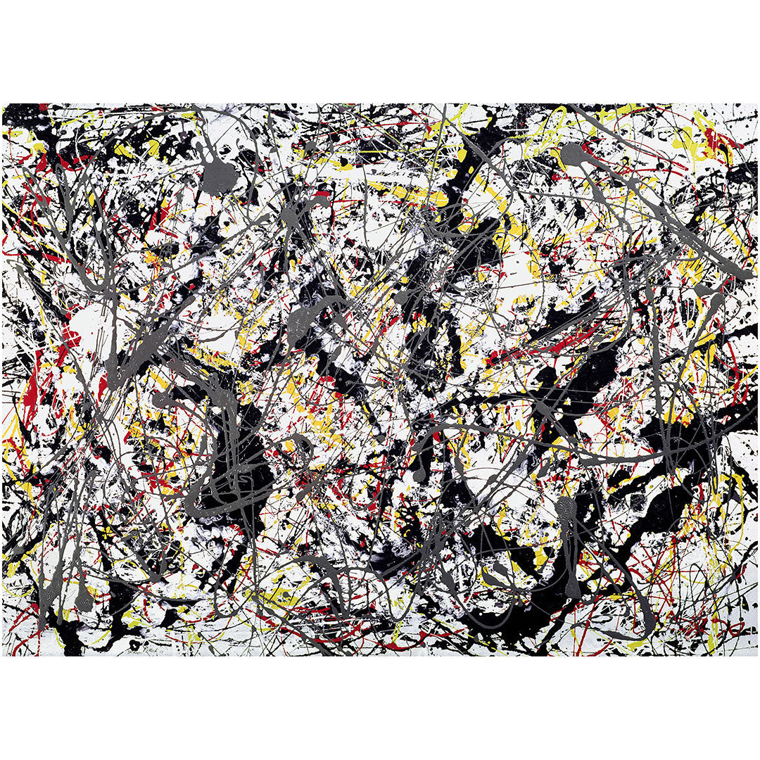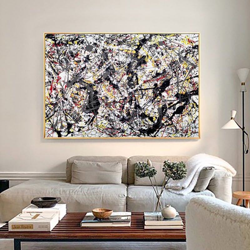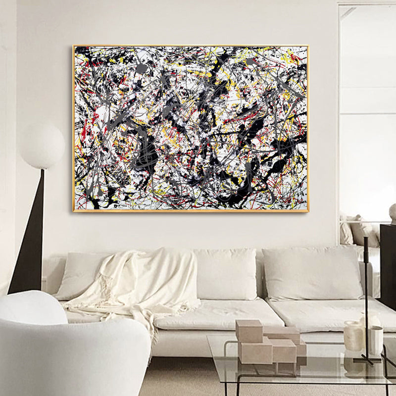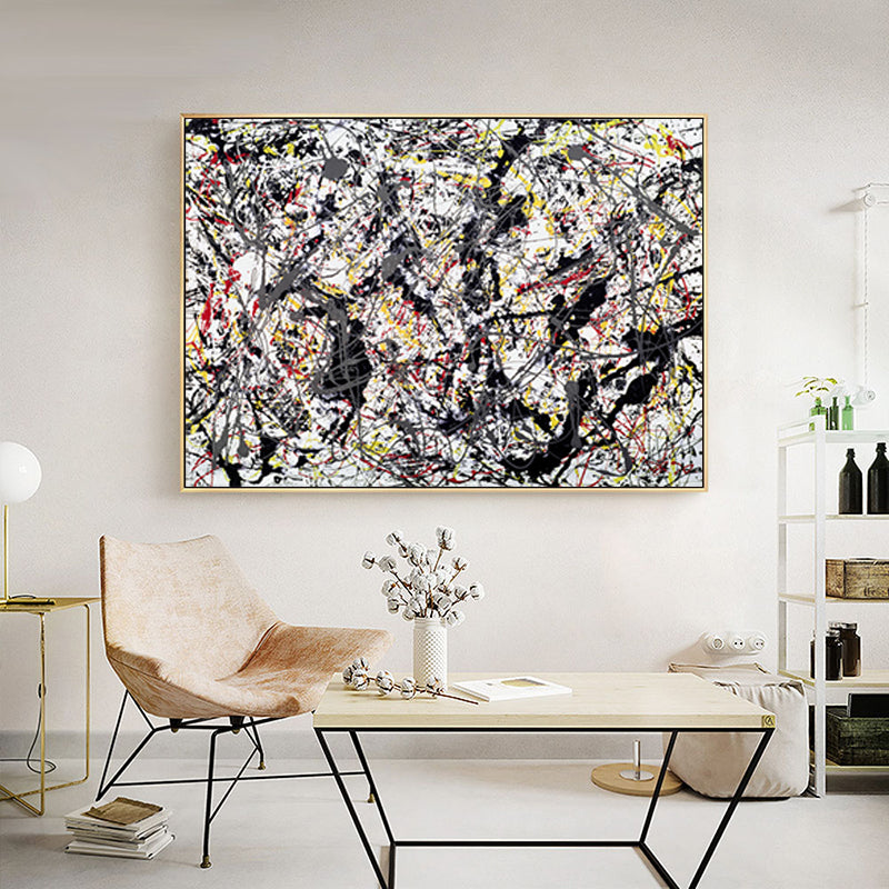 Introducing 'Chroma,' a captivating abstract painting that catches your eye. Bursting with black, red, yellow, and grey colors against a white background, it creates an exciting and energetic display. This stunning artwork is perfect for creating a lively and vibrant atmosphere anywhere.