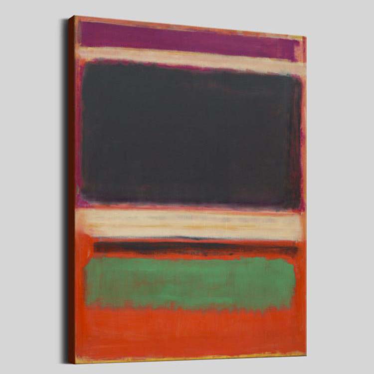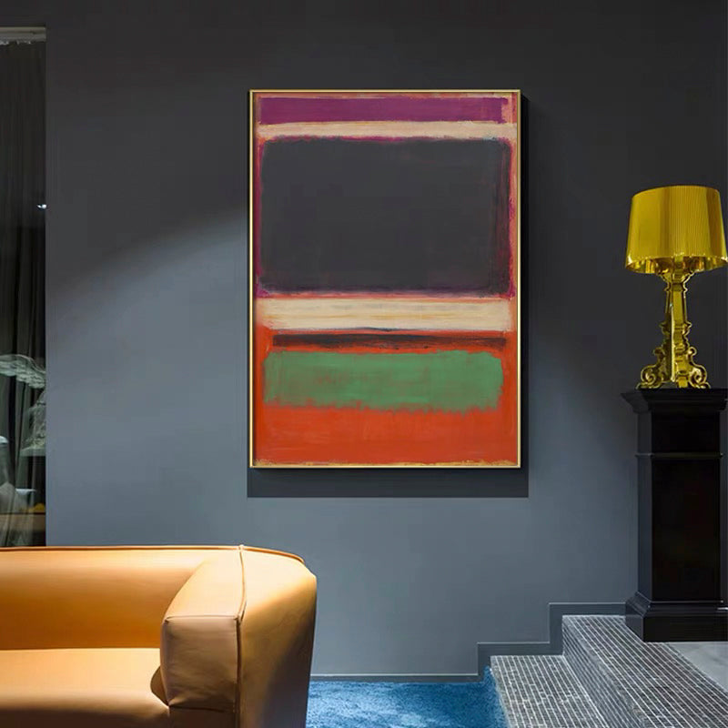 Seeing all the unusual colors blending together beautifully, it feels comforting and cozy. This modern art piece displays a minimal composition with a maximal result. The purple and green work stunningly with the orange background.