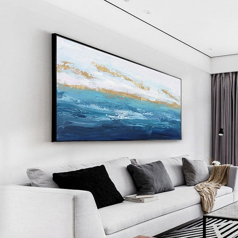 Deep Waters invites you to dive into its serene beauty. The rich blues and shimmering golds create a tranquil ocean scene, perfect for adding a touch of calm elegance to any room.