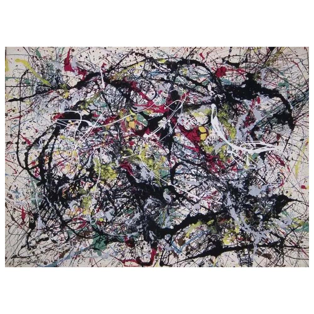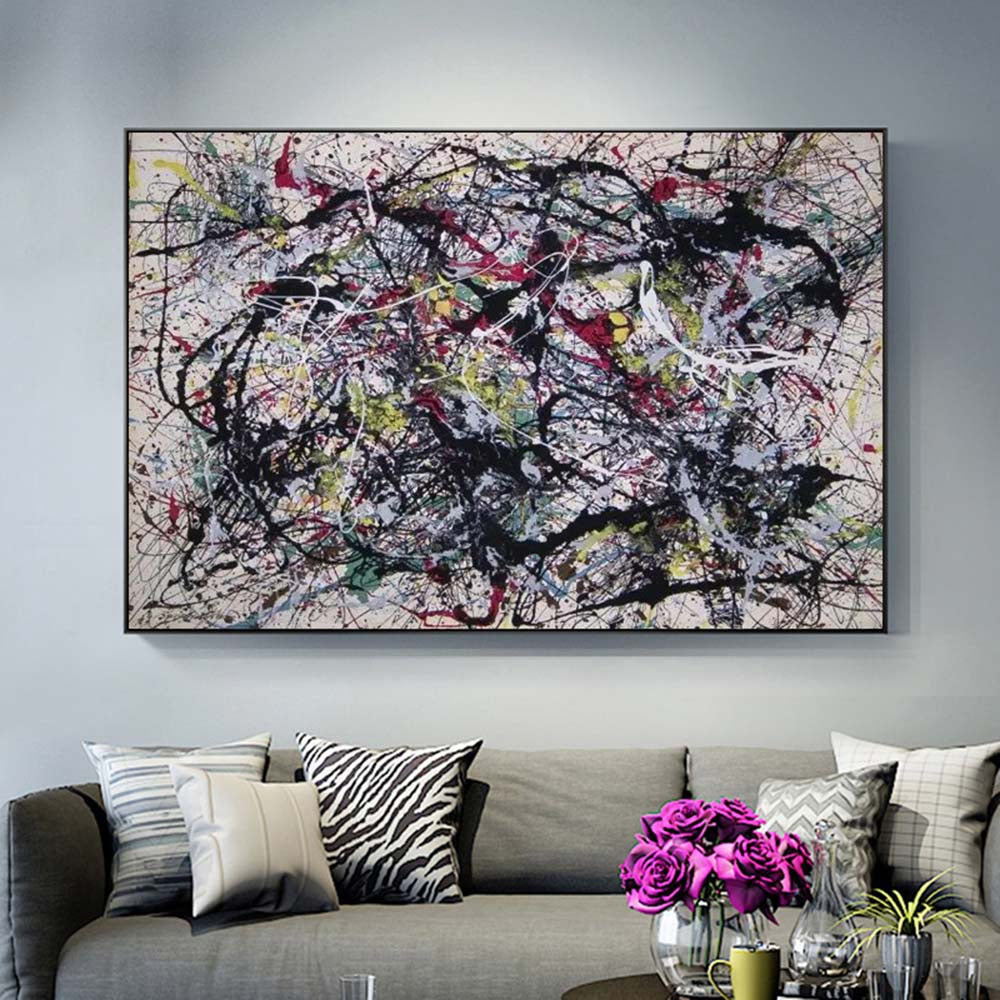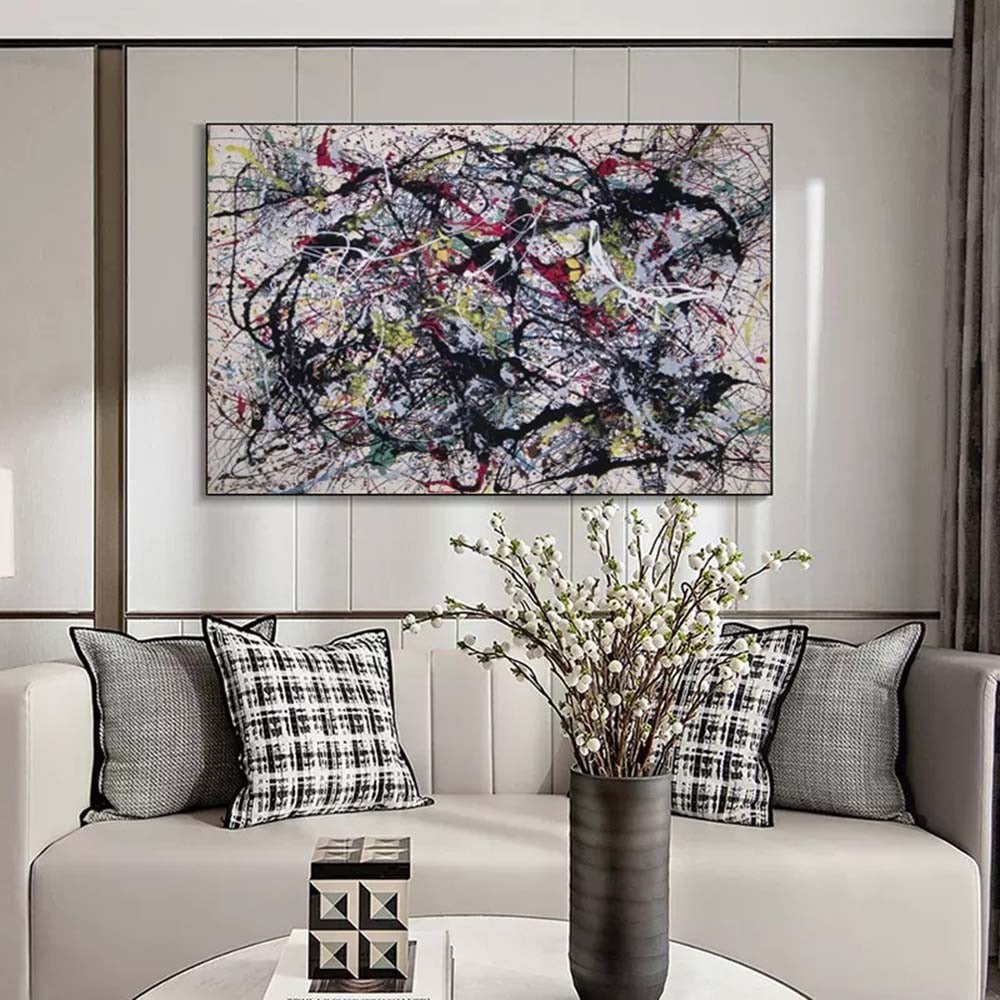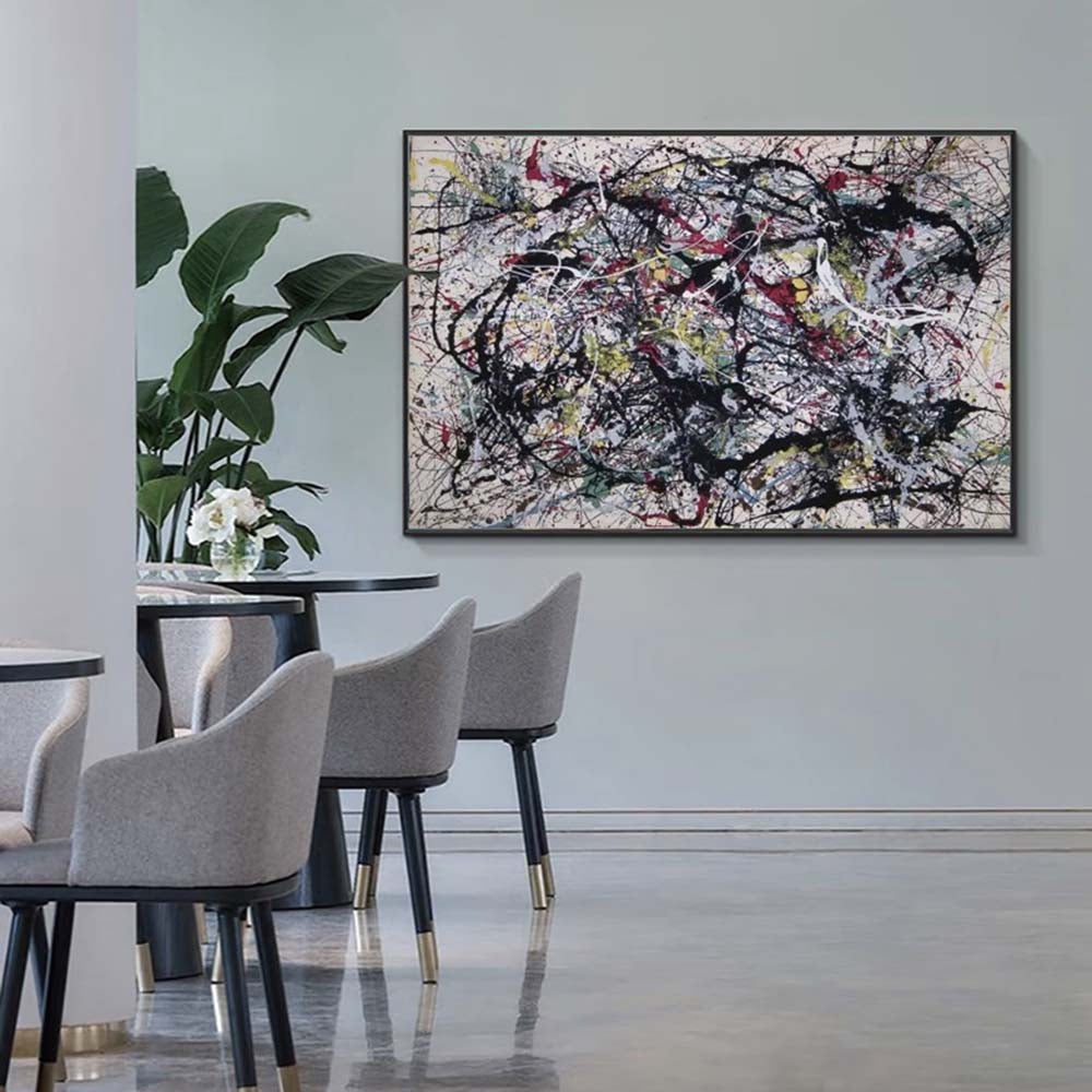 This modern art piece radiates lively energy. Twisting brushstrokes and vibrant bursts of color form a captivating display of abstract expression. The chaotic composition, where colors and shapes mix harmoniously in a rhythmic dance, keeps you interested, time after time!