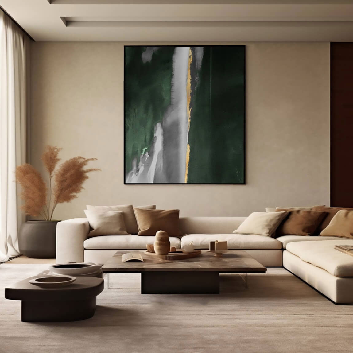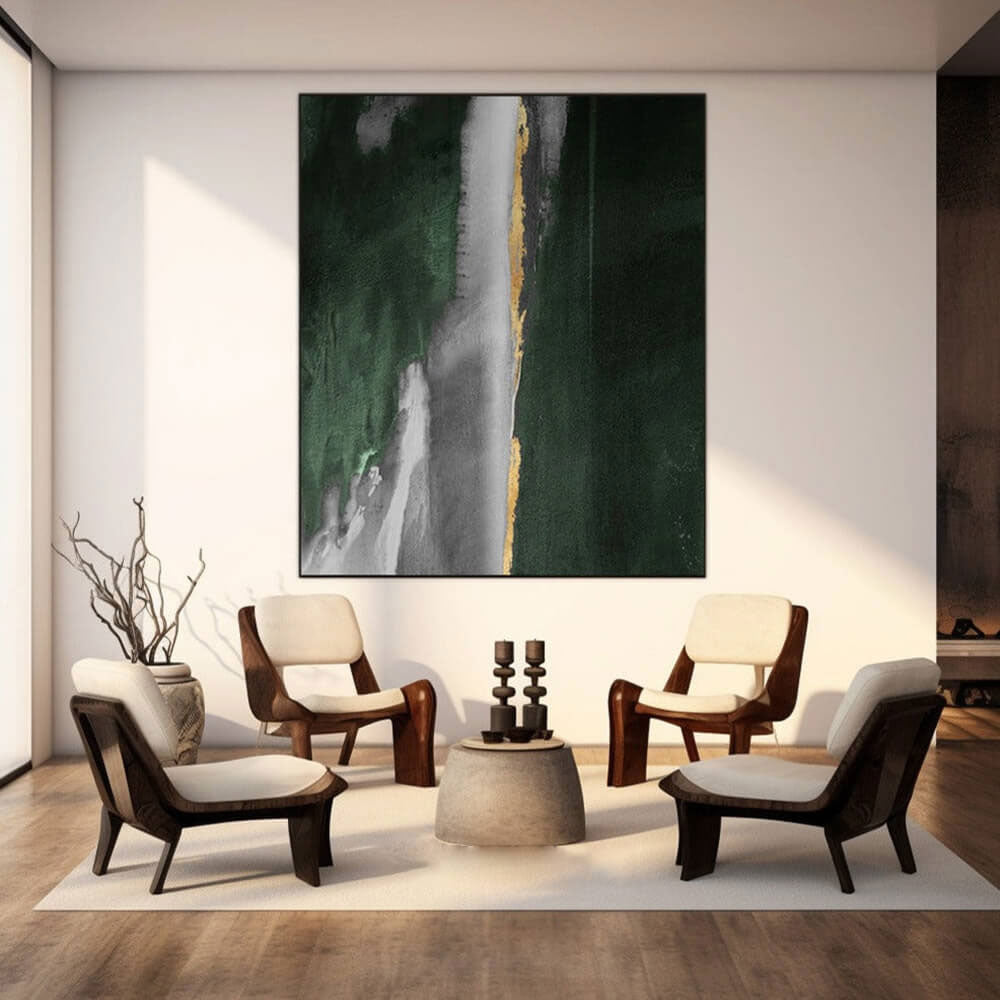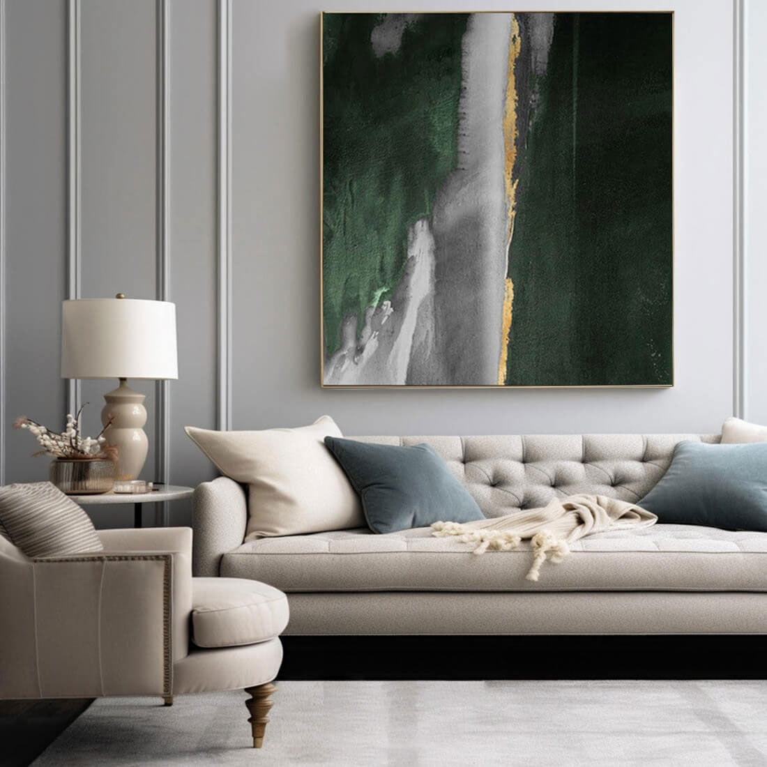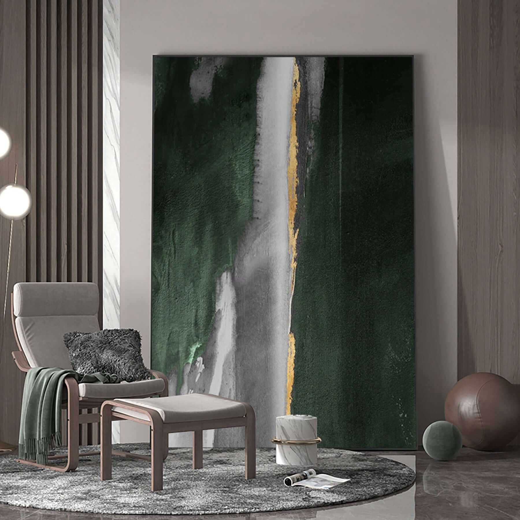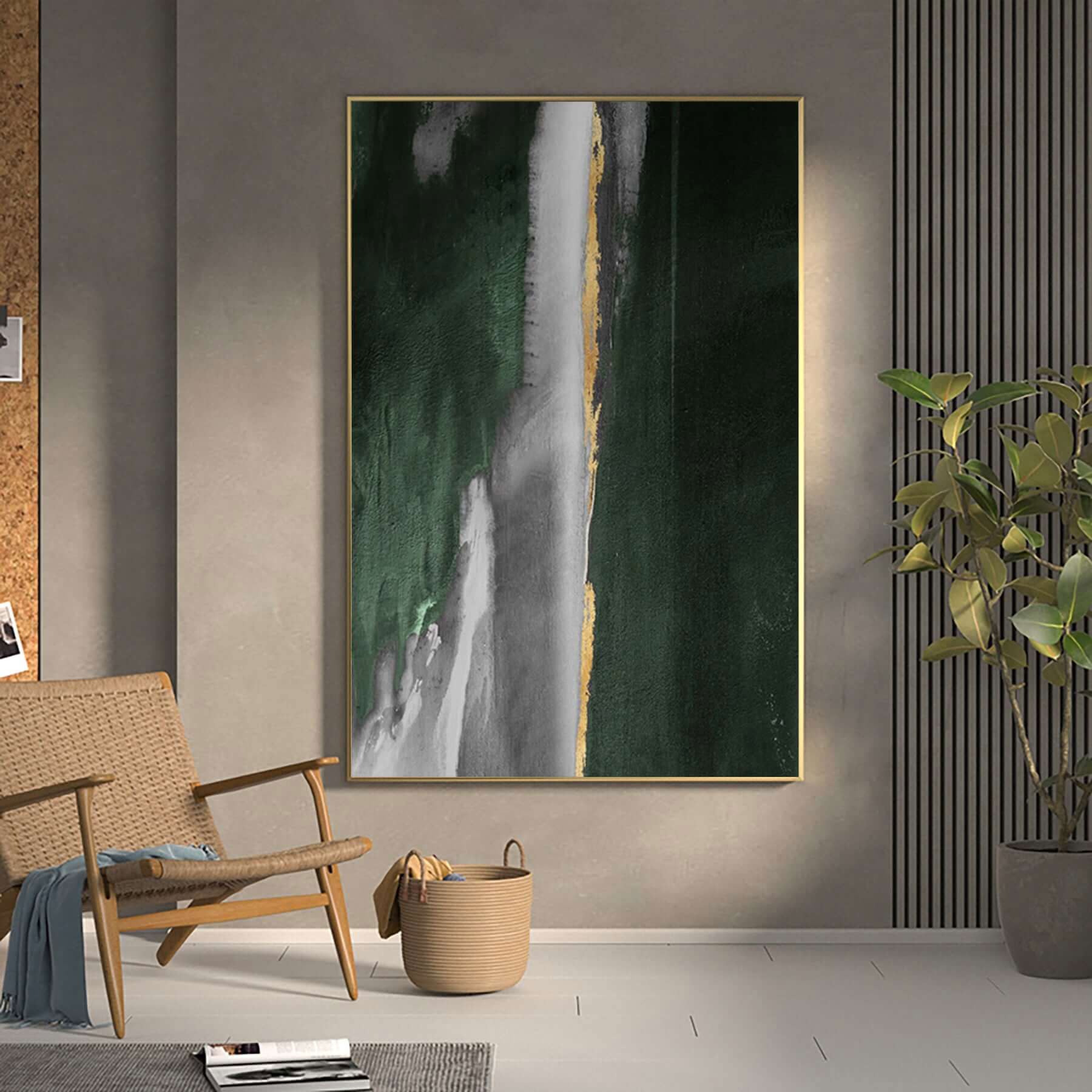 Emerald' is a beautiful abstract artwork with deep greens, soft grays, and shimmering gold accents. It captures the beauty of nature and adds elegance to any room. This stunning piece will bring vibrant energy and sophisticated charm to your home.⁠