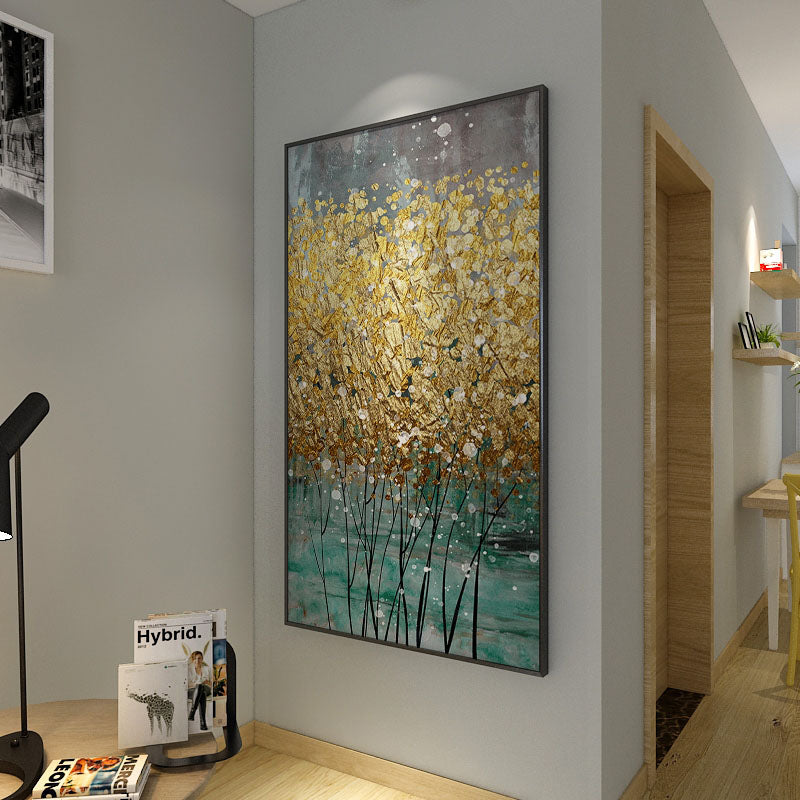 Meaning: 'Golden Flowers' in Spanish, this artwork portrays beautiful golden flowers majestically dangling in the wind. With the use of a special technique, it feels almost as if you can pick the flowers right out of its canvas!