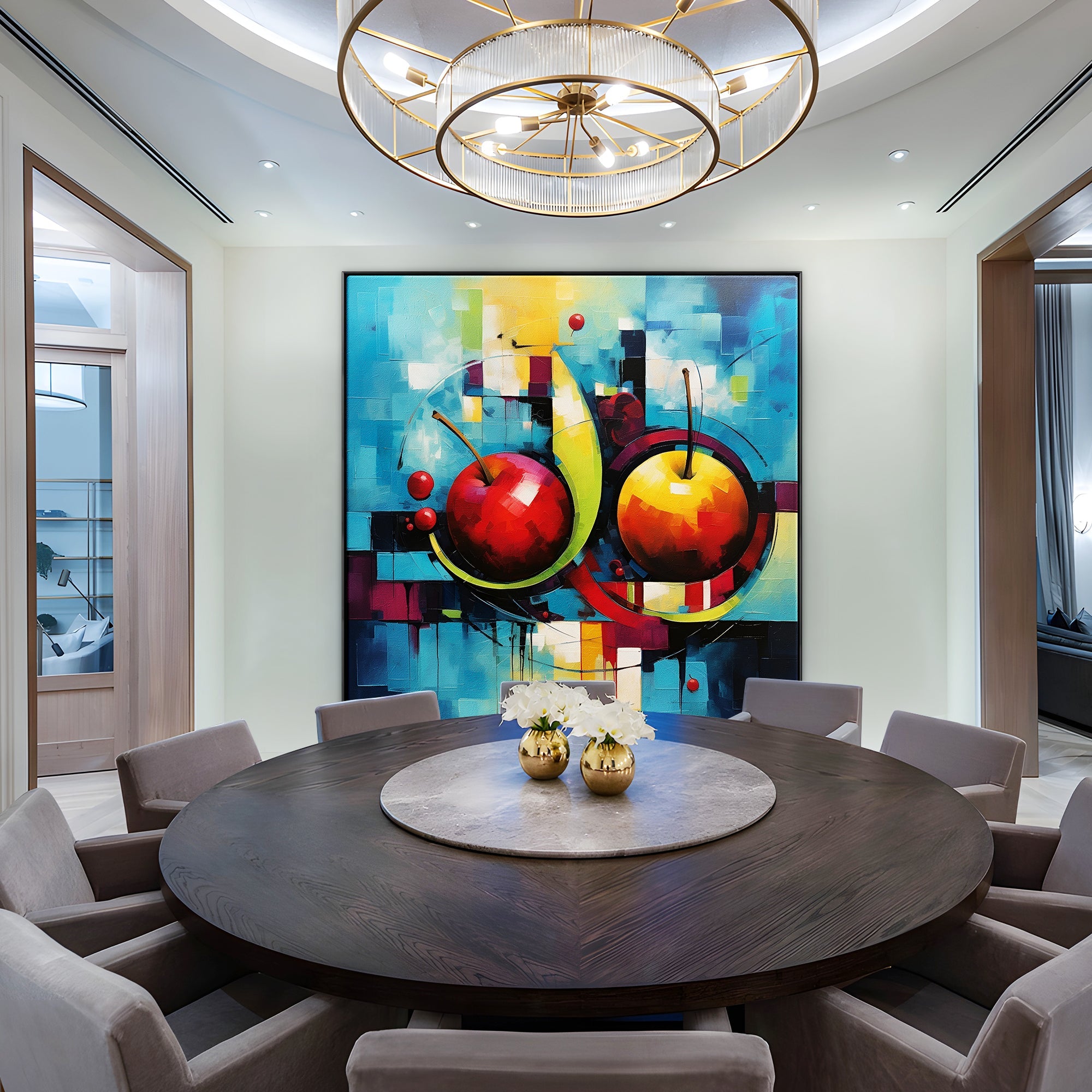 This modern piece 'Futuristic Still-Life' embraces a futuristic aesthetic in a classical setting. Two apples at the heart of this still life challenge tradition, reflecting innovation and simplicity.