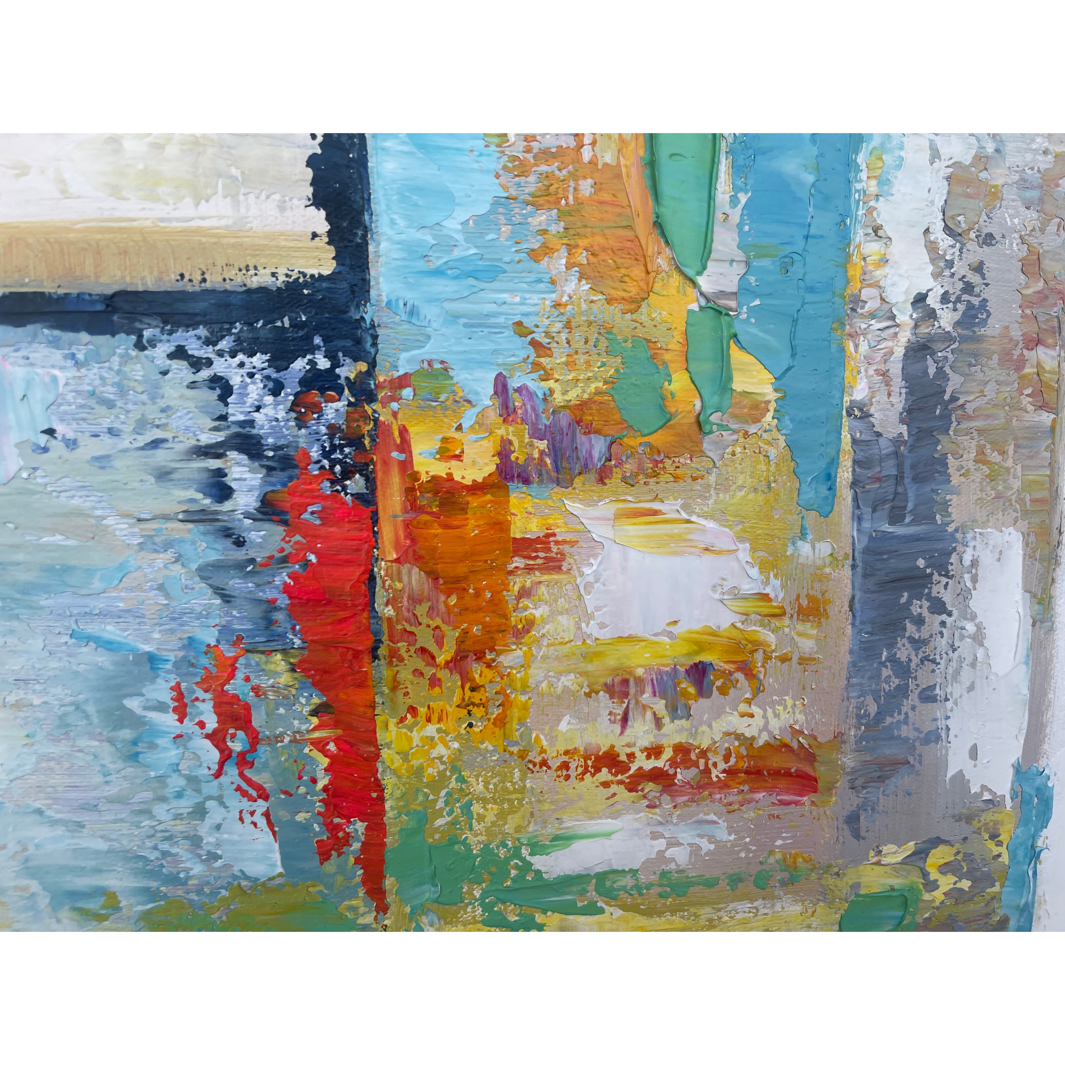 Translated from French, this abstract art piece is named: 'The Past'. Sometimes we wish we could change our past, but we also have to appreciate the good things. This modern piece expresses this feeling beautifully. With many vibrant colors, the future looks bright!