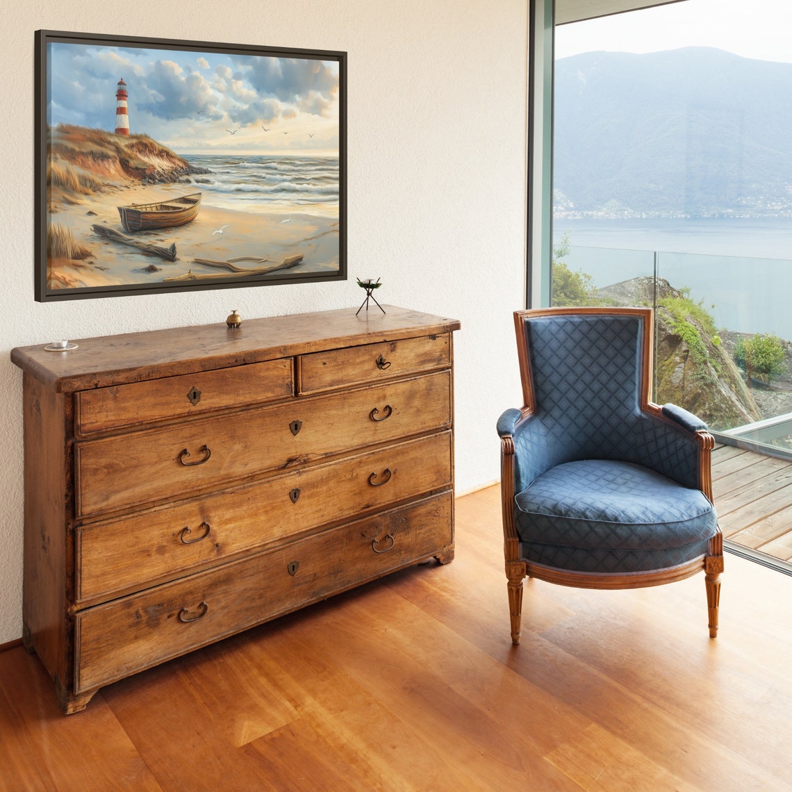 With soft clouds, golden dunes, and a classic lighthouse standing tall, this painting transports you straight to the coast. The gentle waves and the nostalgic atmosphere make it an ideal piece for anyone dreaming of a seaside escape.