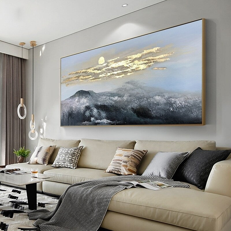 With mountain tops so high that they almost touch the sky, these 'Misty Moon Mountains' are a beautiful sight to behold. The golden mist floats like a beautiful blanket over the snowy summit. This gives the artwork a sense of mystery and sophistication!