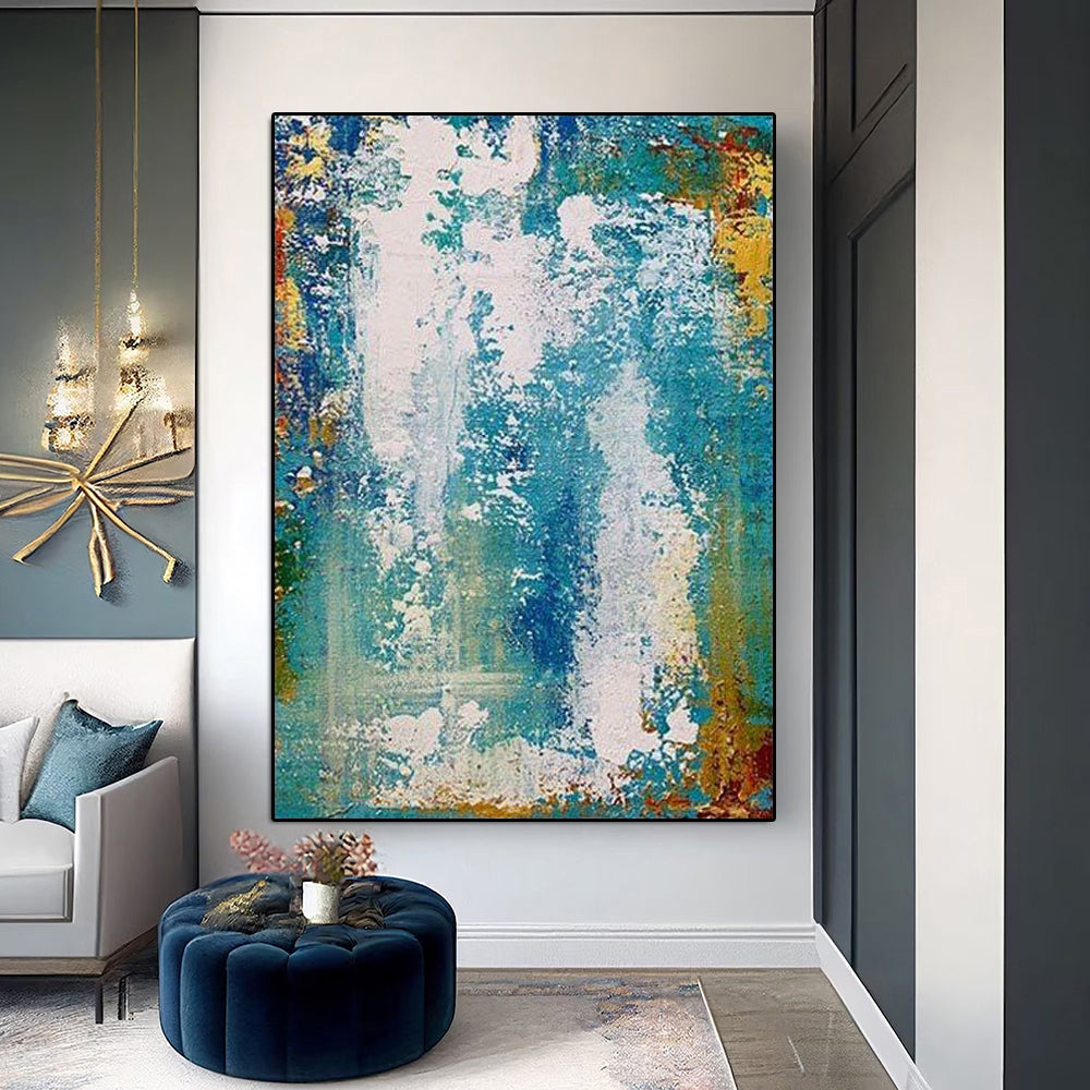 This artwork captures the essence of nature with its earthy tones and textured patterns. The interplay of blues, greens, and golds creates a harmonious visual that feels like a walk through a unique, serene forest.