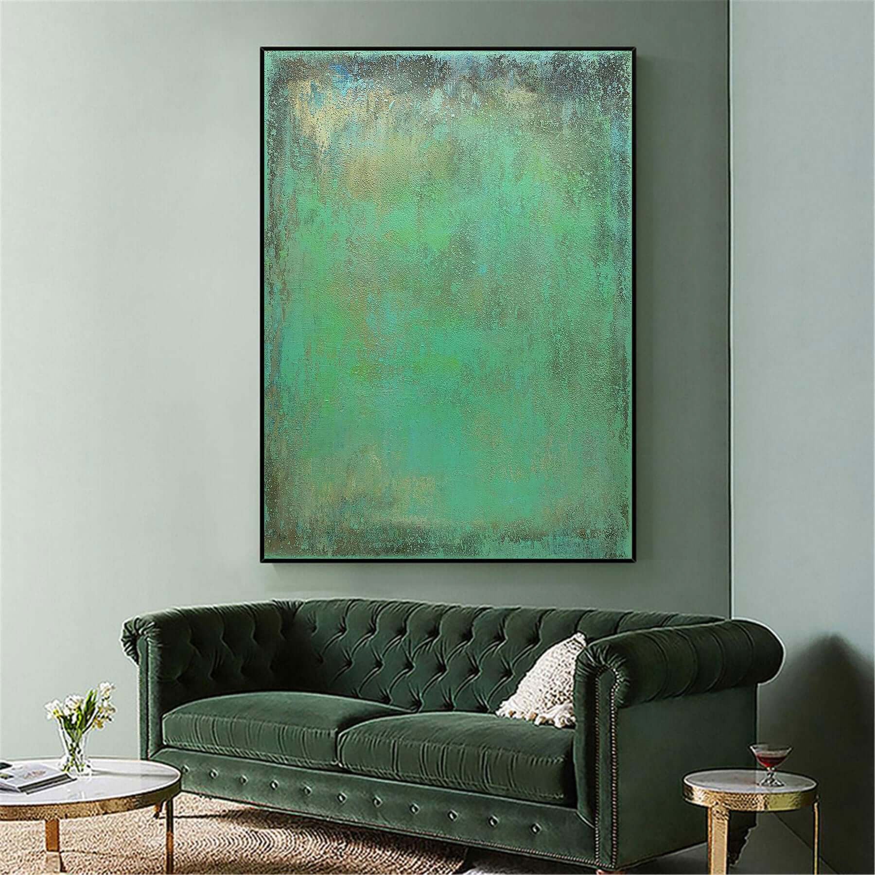 "With 'Mossy,' your walls gain a piece of the forest. The painting’s subtle green hues and textured depth create a serene, earthy vibe that will transform any room into a calming retreat.