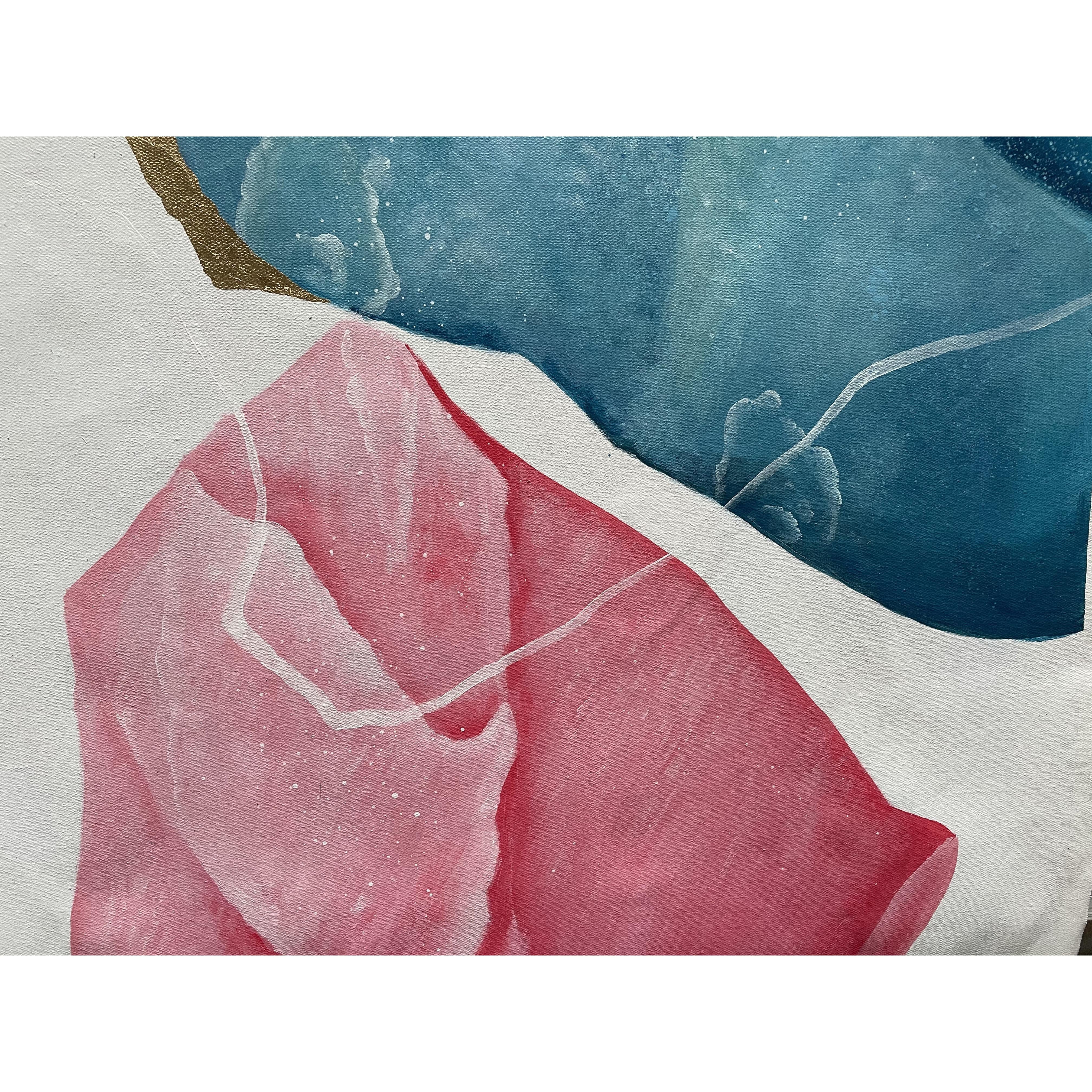 A true gemstone of a painting! Its fresh contrasting colours make this painting very pleasant and satisfying to look at. They say an opal takes on the colours of the light that shines upon him. The soft blue, the lovely pink and the sturdy black are just a few examples of its many colours!