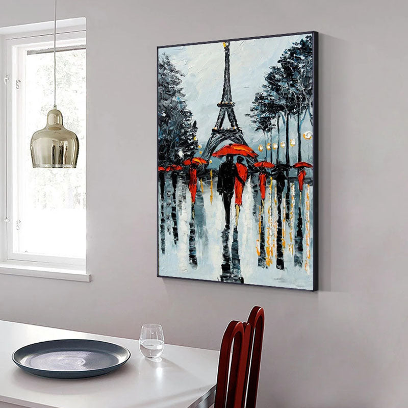 Despite the rain, the famous Eiffel Tower still stands strong as one of Paris's most romantic and beautiful landmarks! The red colors contrast beautifully with the surrounding colors, and the realistic reflection is the cherry on top!