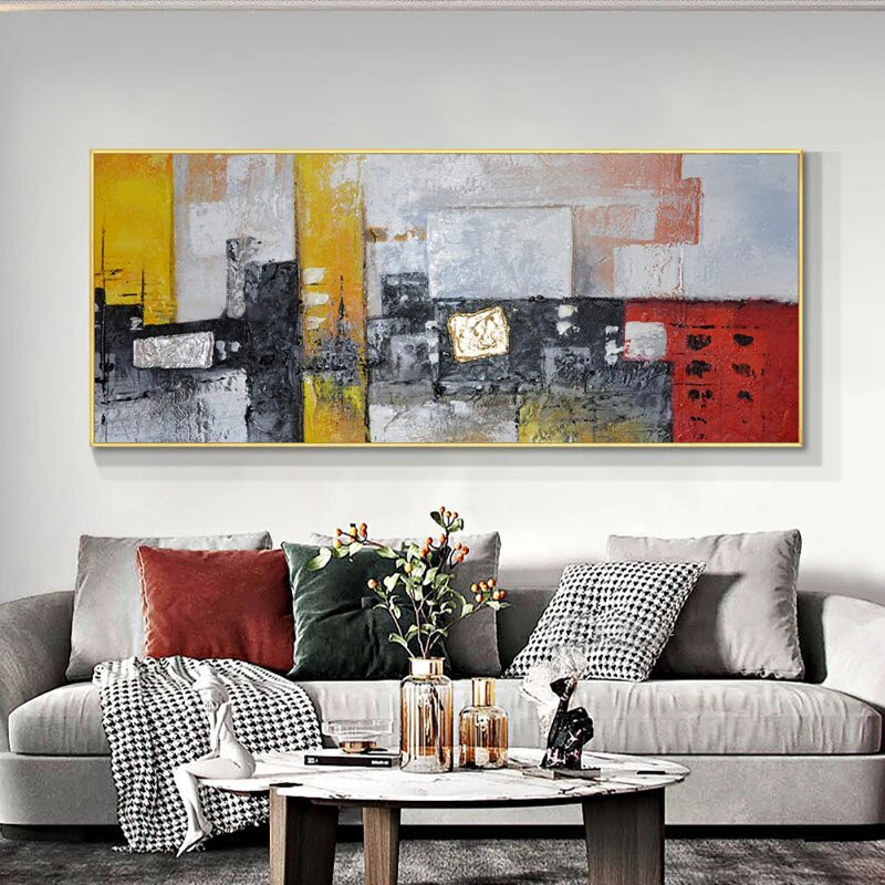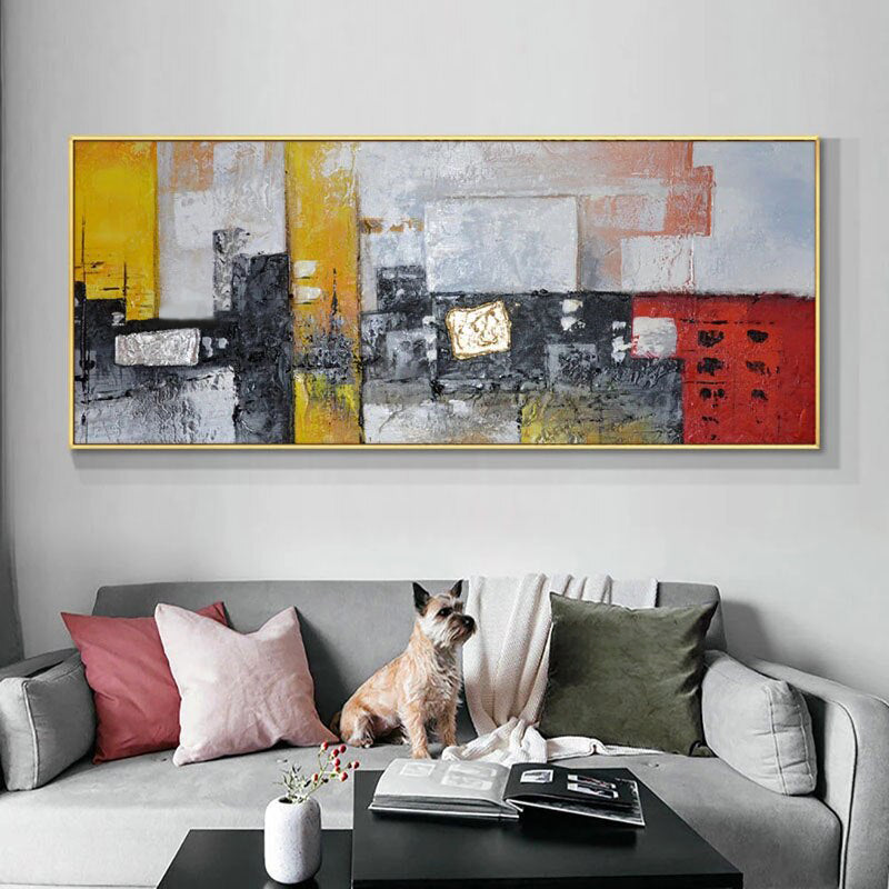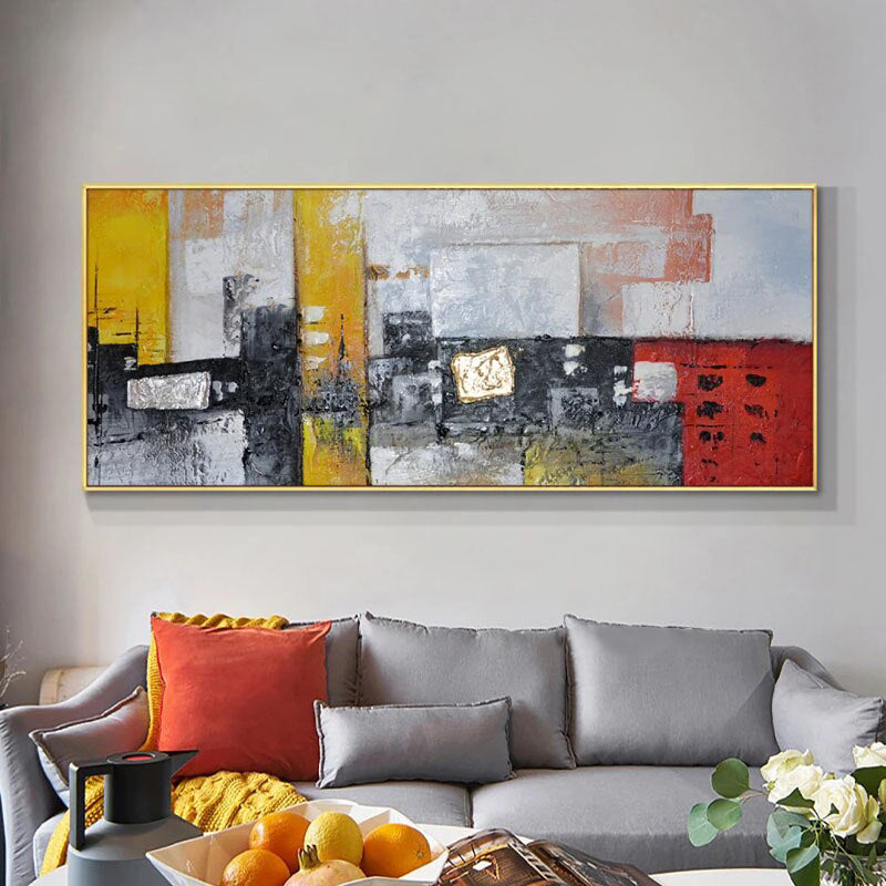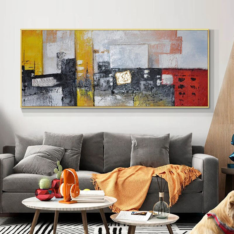 Textures collide and colors pop in this amazing modern art piece. Its bold hues and dynamic design speak to a spirit of innovation and energy, making it the perfect focal point for your home.