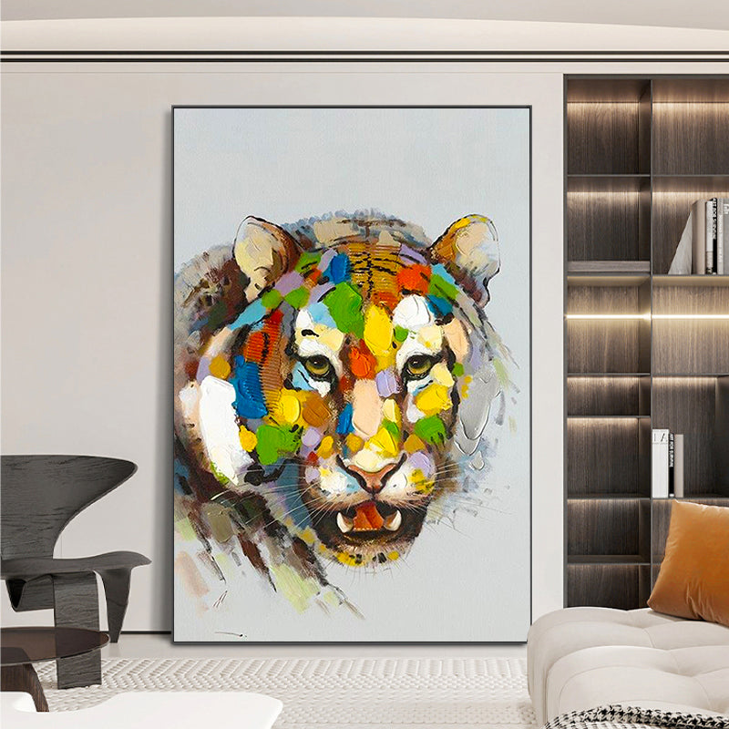 Step into the wild with 'Roar in Color,' where a vibrant lion locks eyes with you. This dynamic painting captures the fierce elegance of nature, inviting you to embrace the roar of life in a brilliant burst of color.