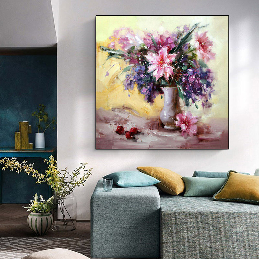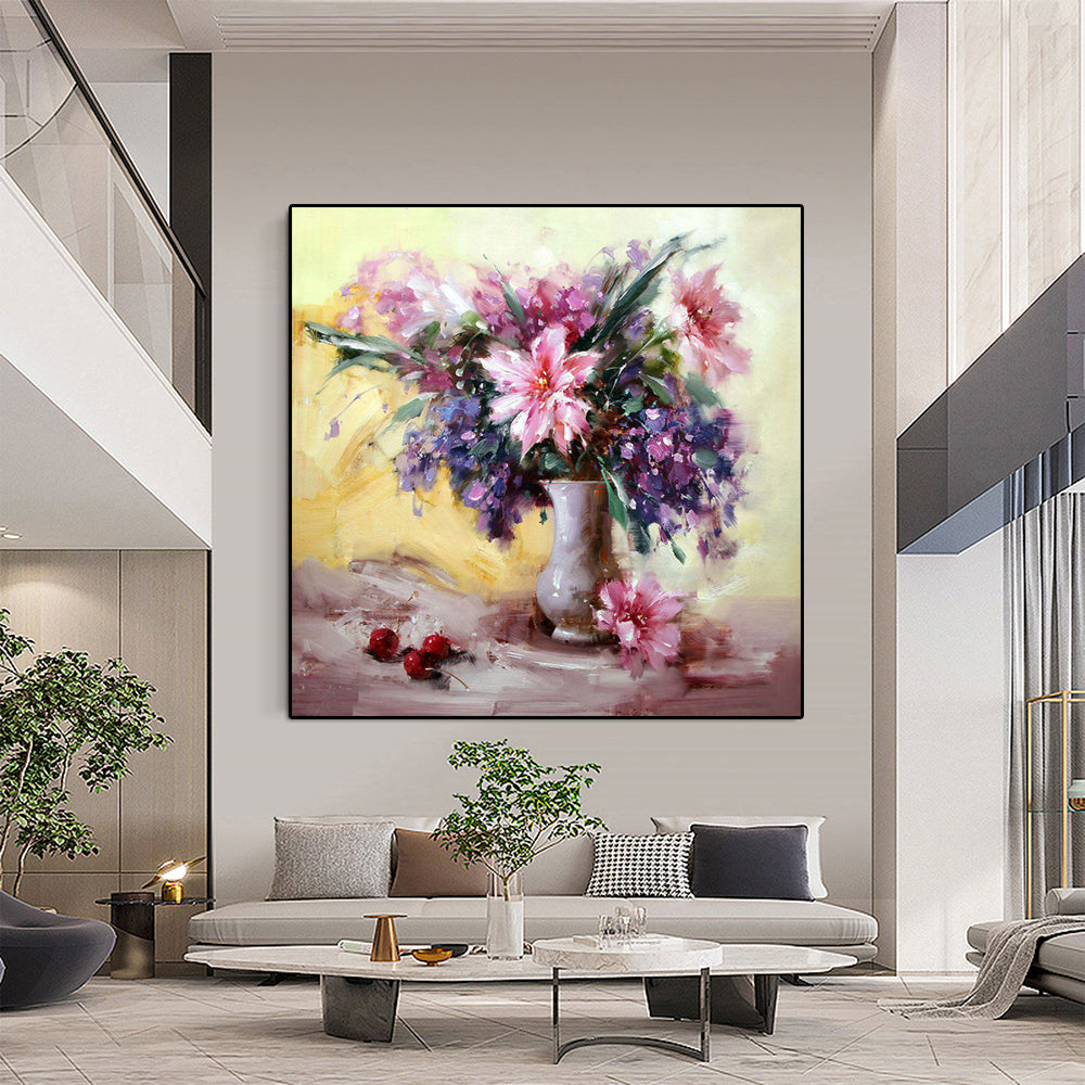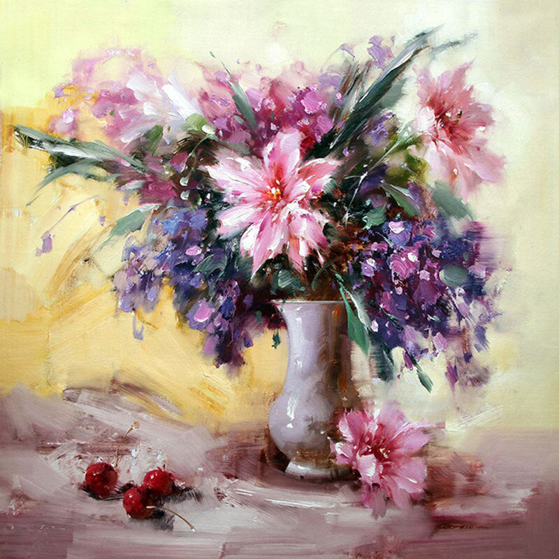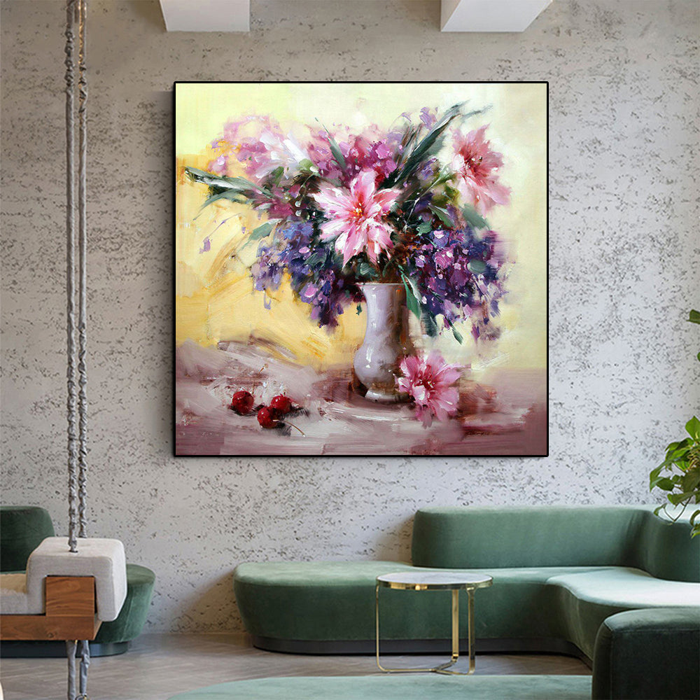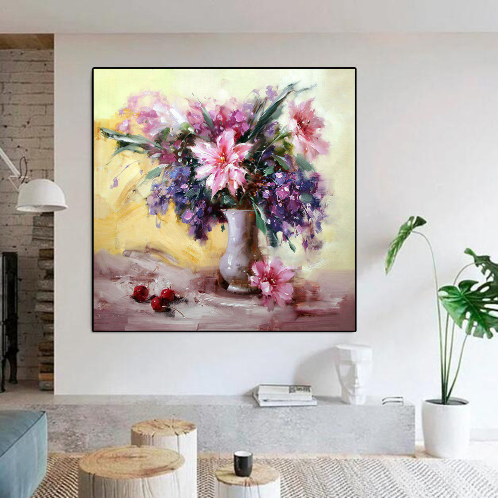 "Romantic Still Life" is a celebration of love and beauty. The soft pastels and vivid blossoms radiate charm, while the cherries add a playful touch. It’s a timeless piece that turns any space into a haven of warmth.