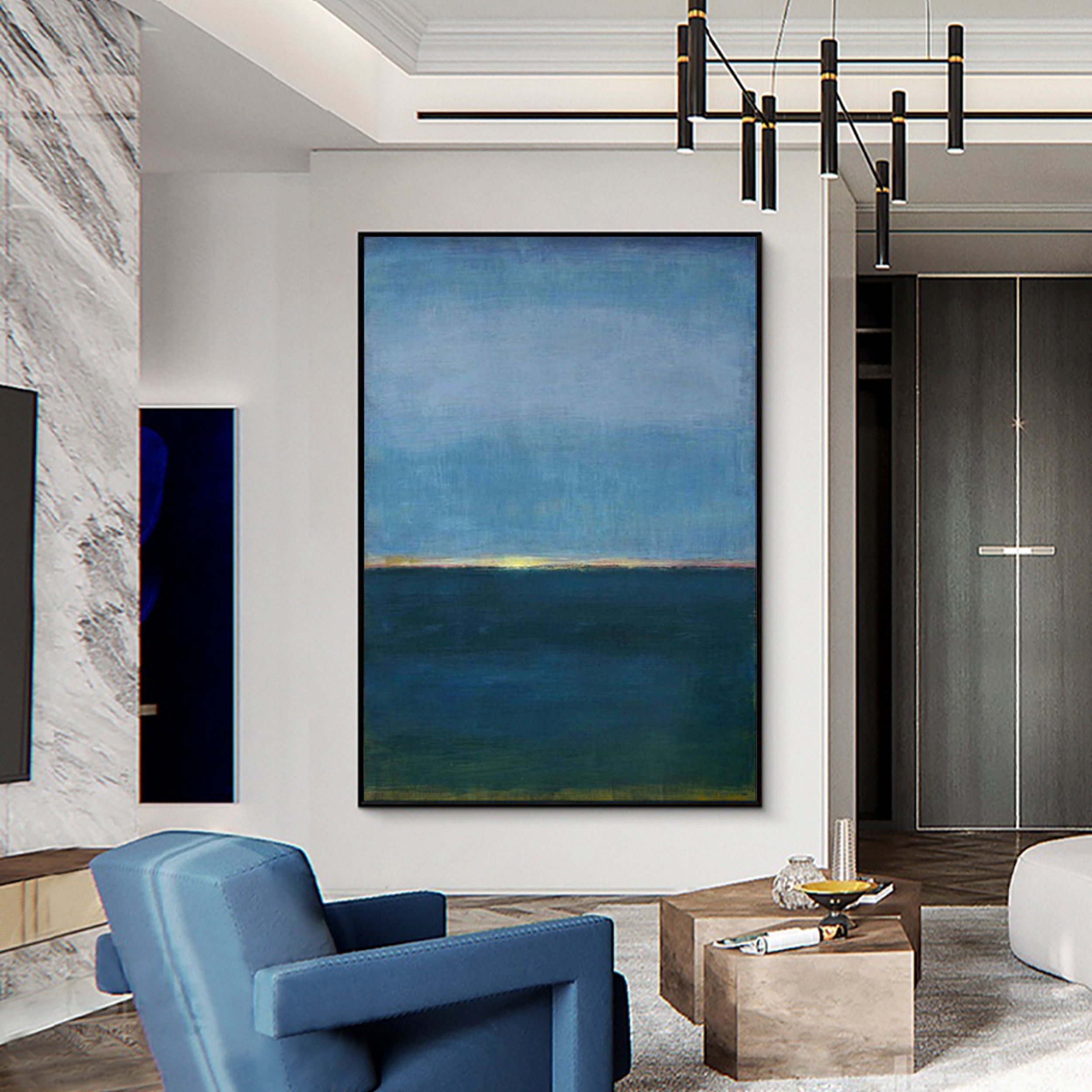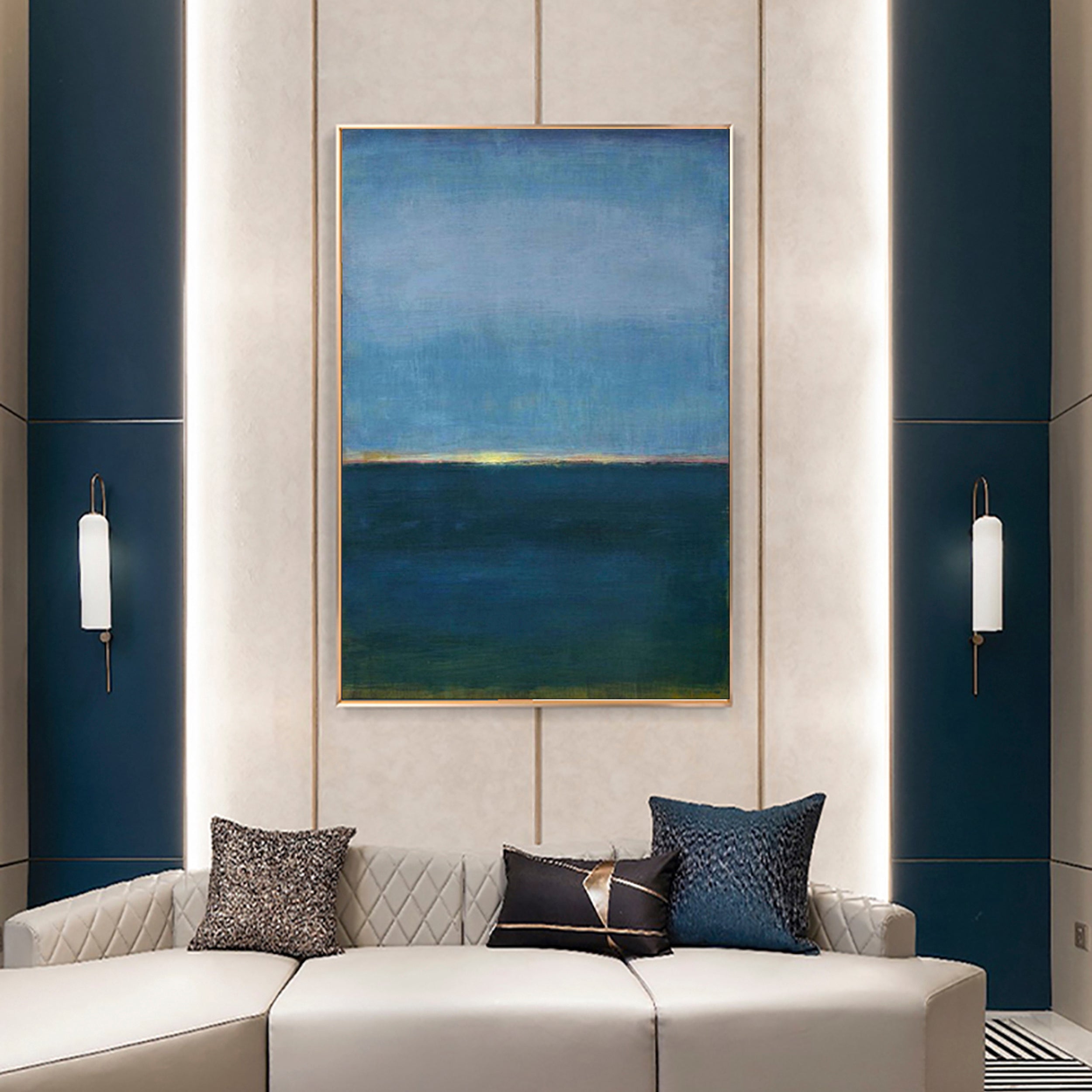 This beautiful art piece just radiates pure peace and tranquillity. With subtle, blue colors and a composition that leads the eye to the stunning, golden horizon, this painting is a sophisticated addition to any type of home interior!