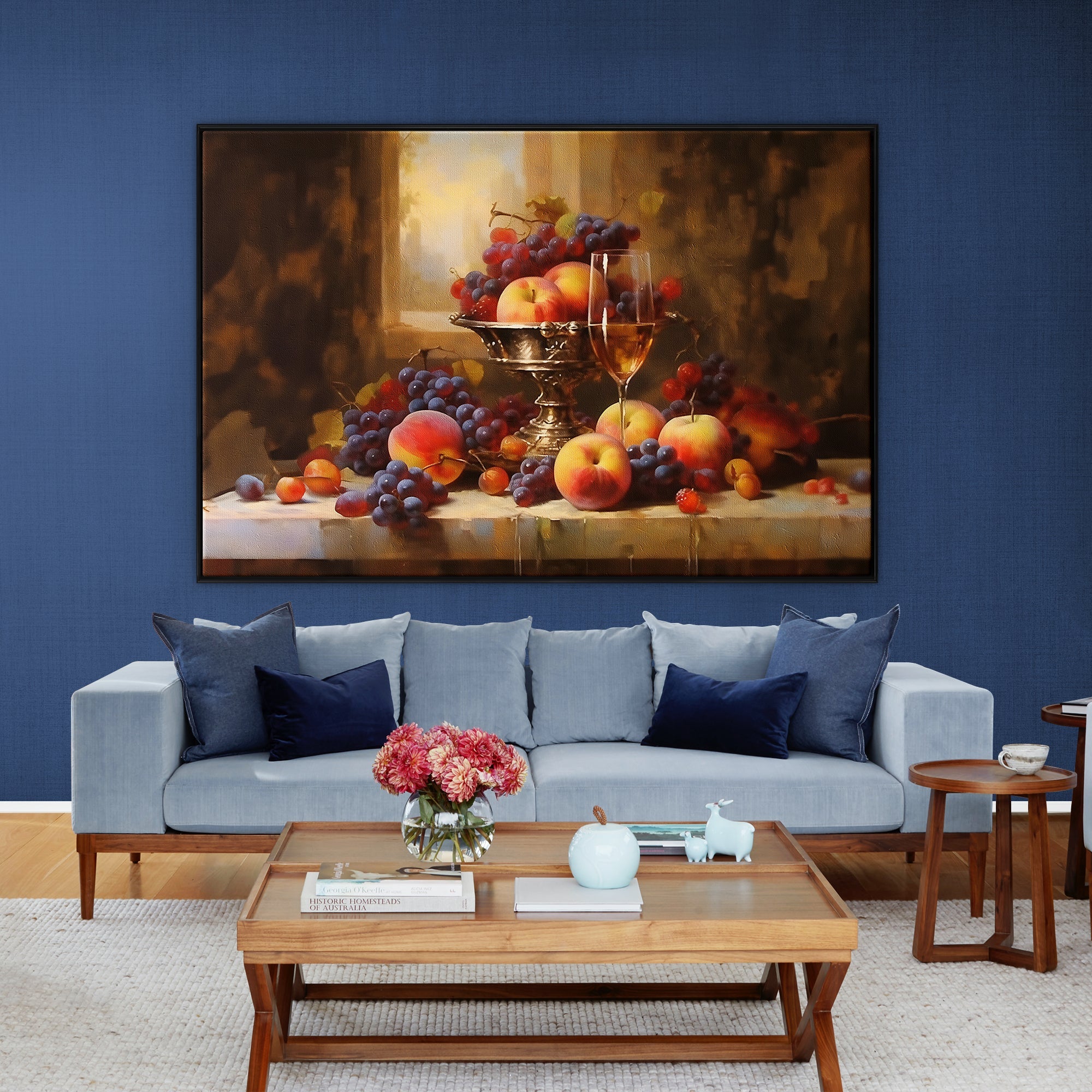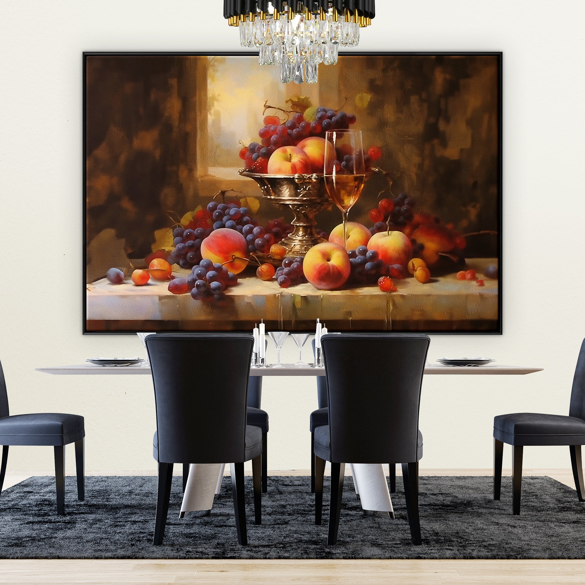 Experience elegance through this exquisite still life. The fruits seem almost edible in their lifelike presentation, making it a feast for the eyes. The stunning realism-style makes this painting a rich and sophisticated addition to any space or room.
