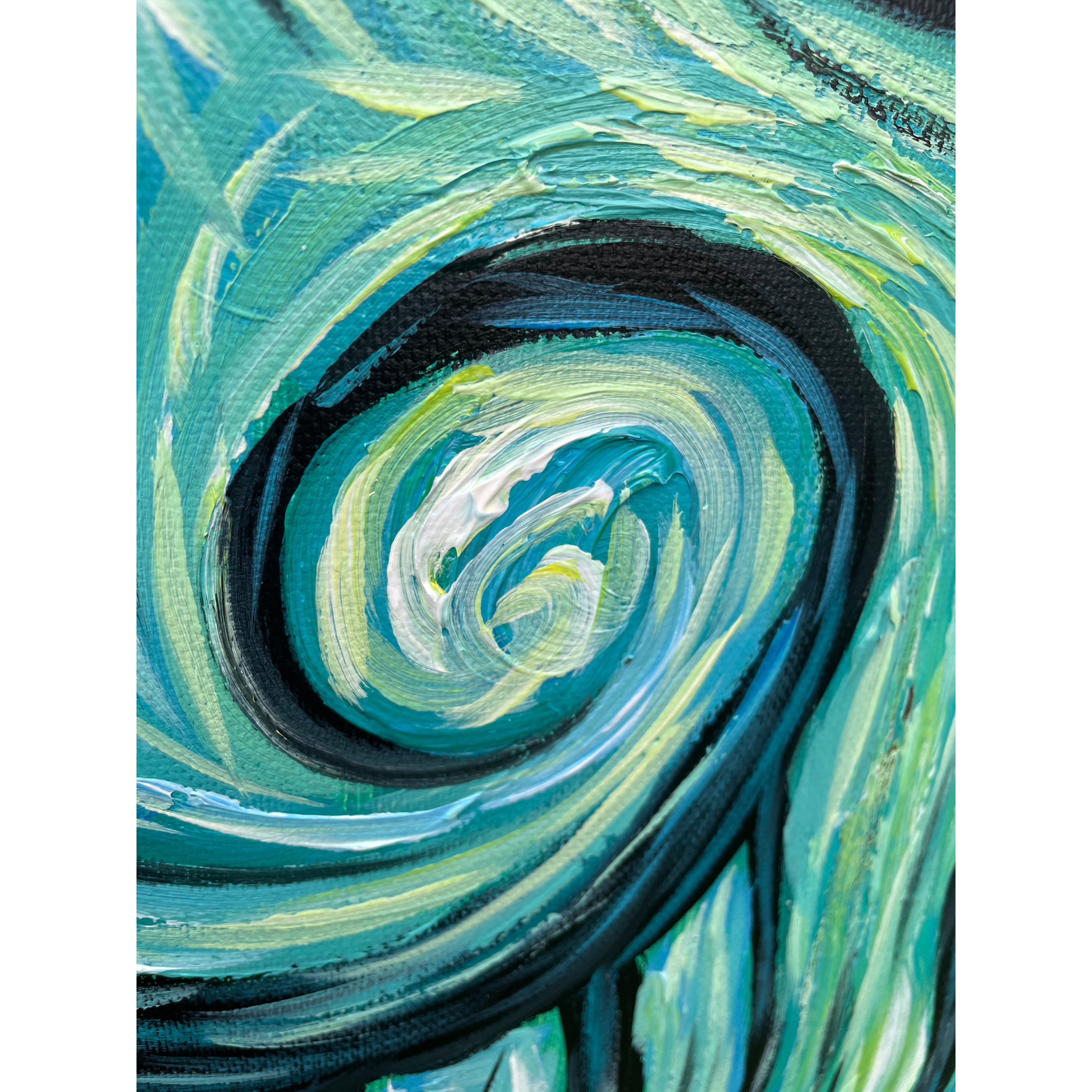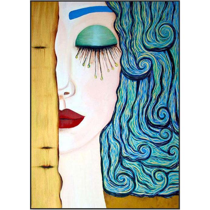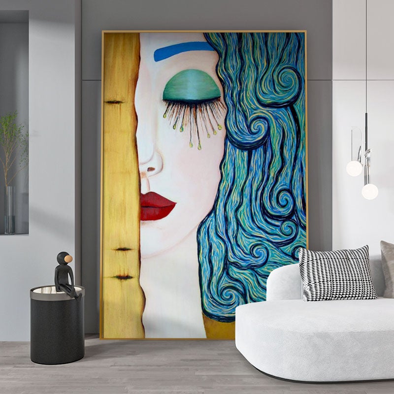It's the perfect painting to add a splash of elegance to your home. 'Starry Tears' features a woman with hair-like waves. The composition is simple and elegant, with a color palette that makes it pop on any wall!