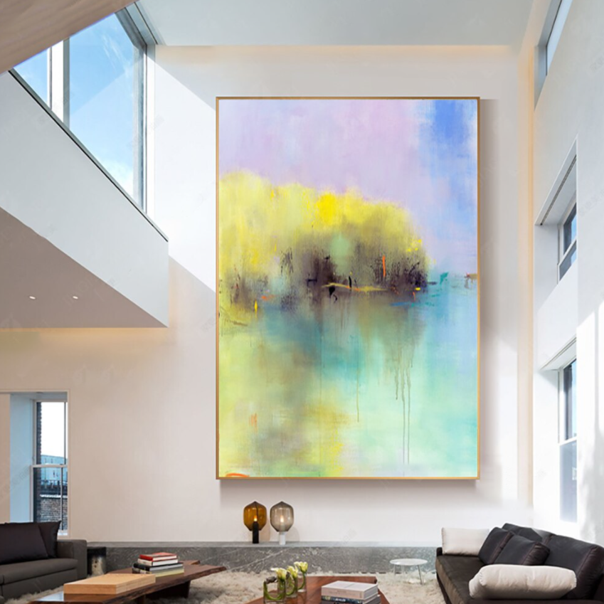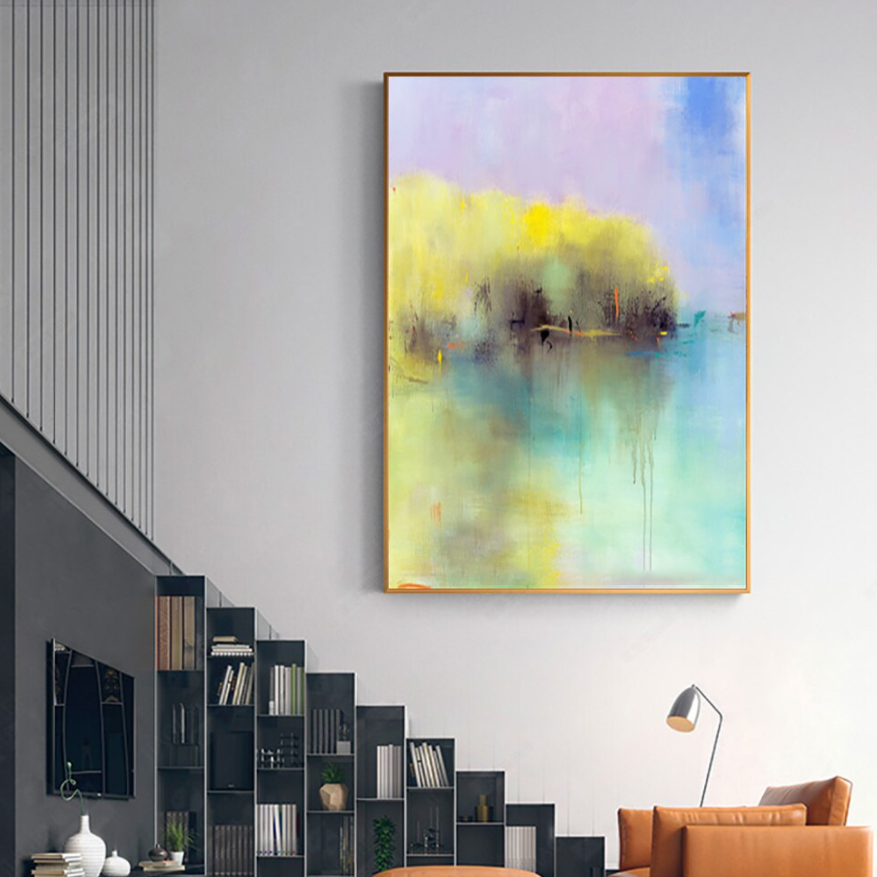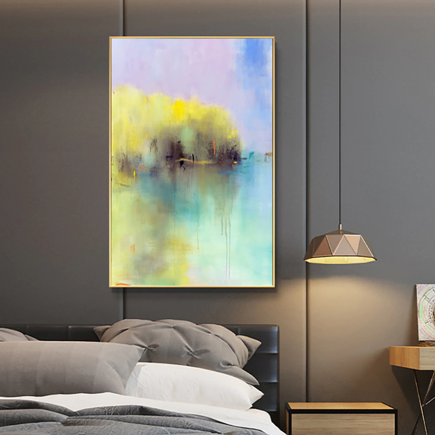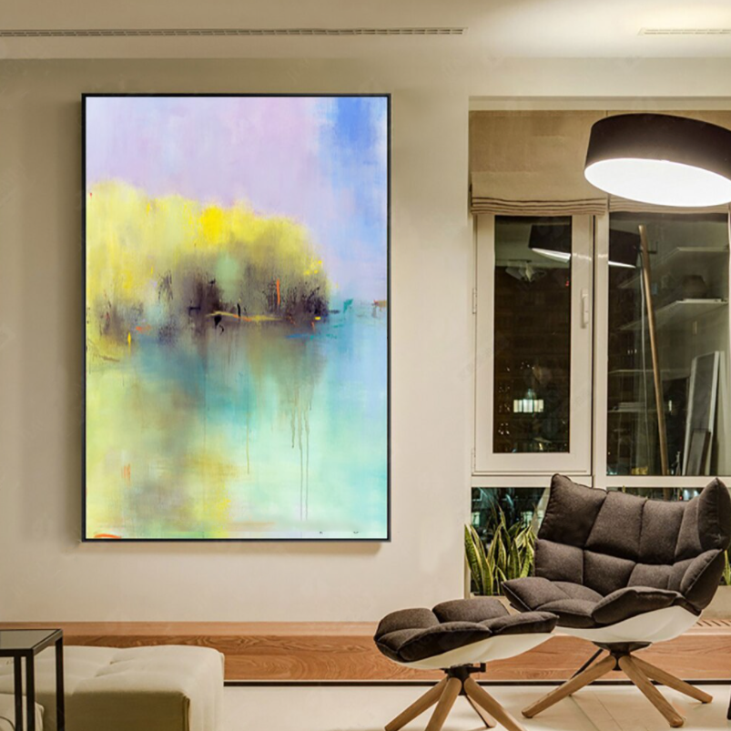 Summer Holidays is an abstract painting that features a lakeside scene. The blue and yellow colors in the painting are beautiful and are inspired by the memory of a summer holiday in your childhood.