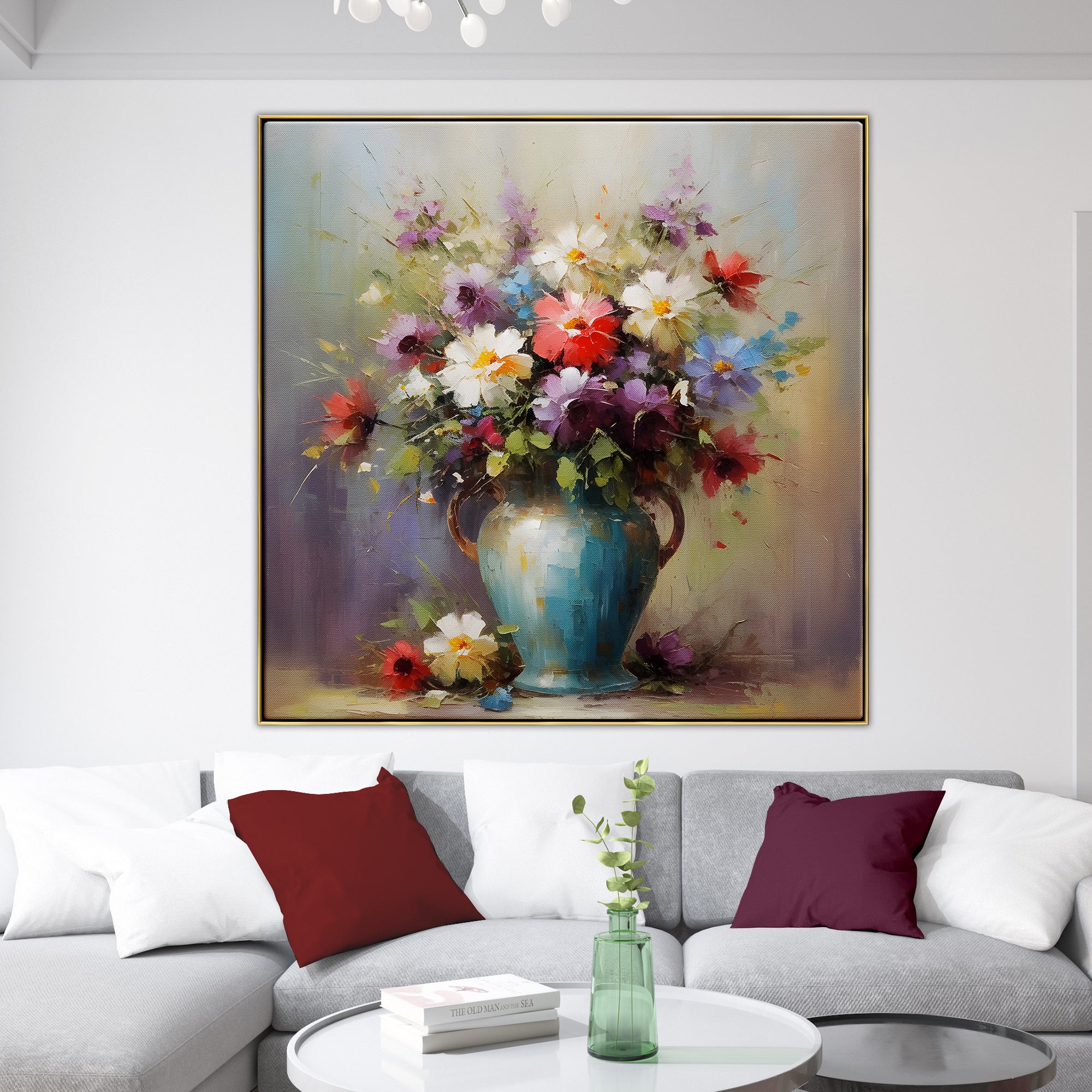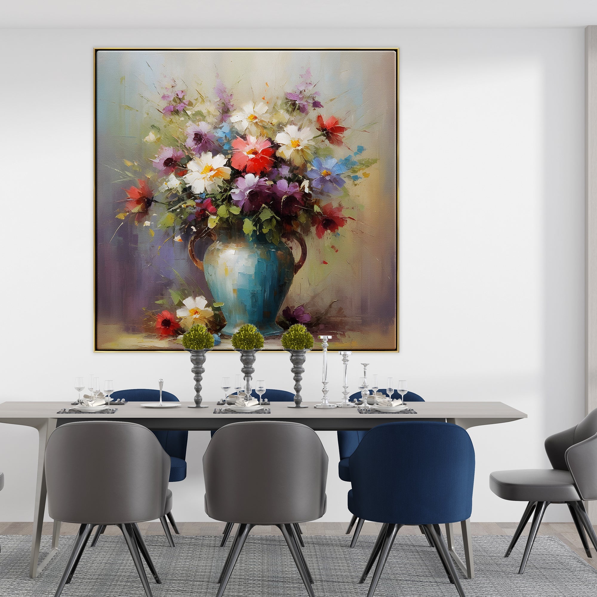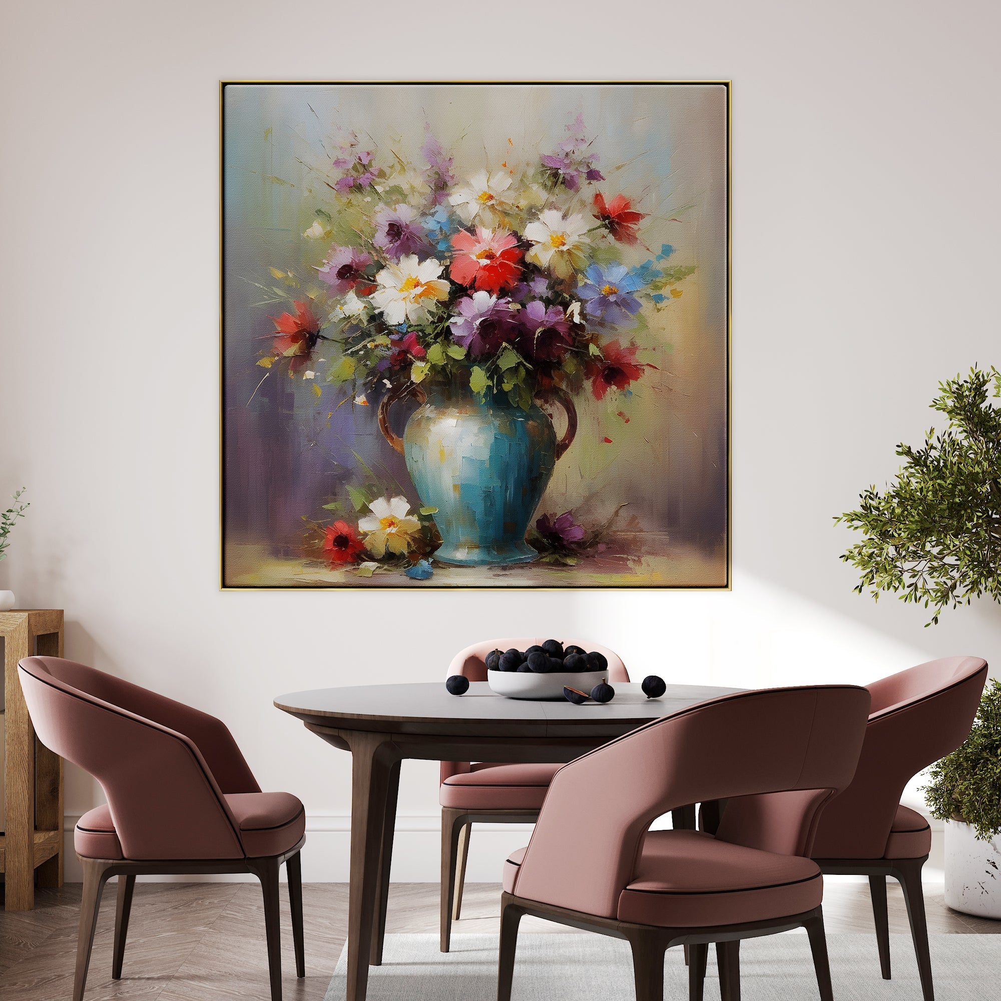 This unique still life painting is a vase full of sunshine. Its dynamic style and textured flowers brighten any room or space, creating the essence of a sunny day.