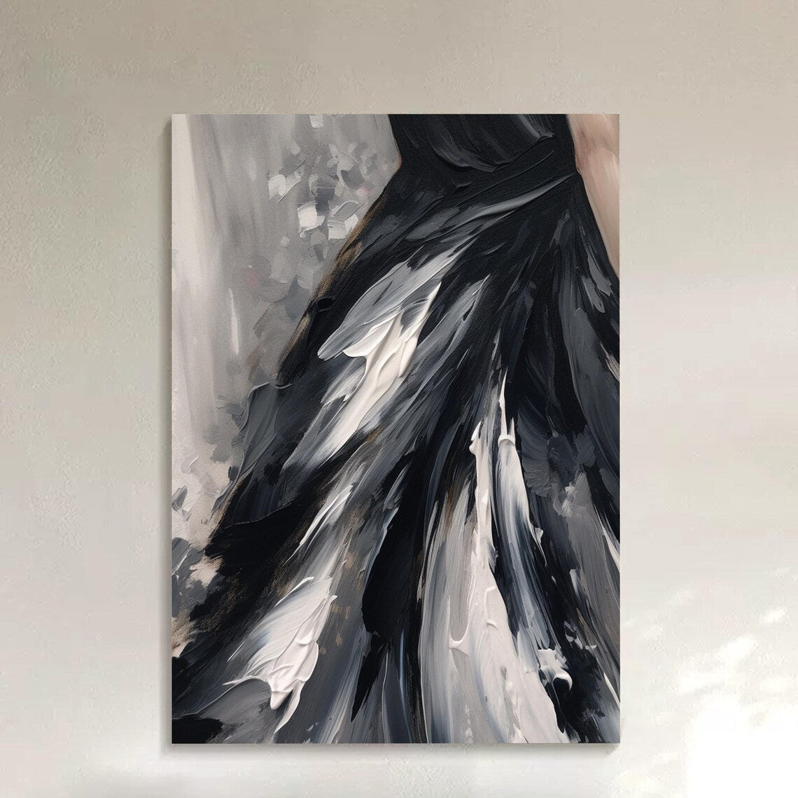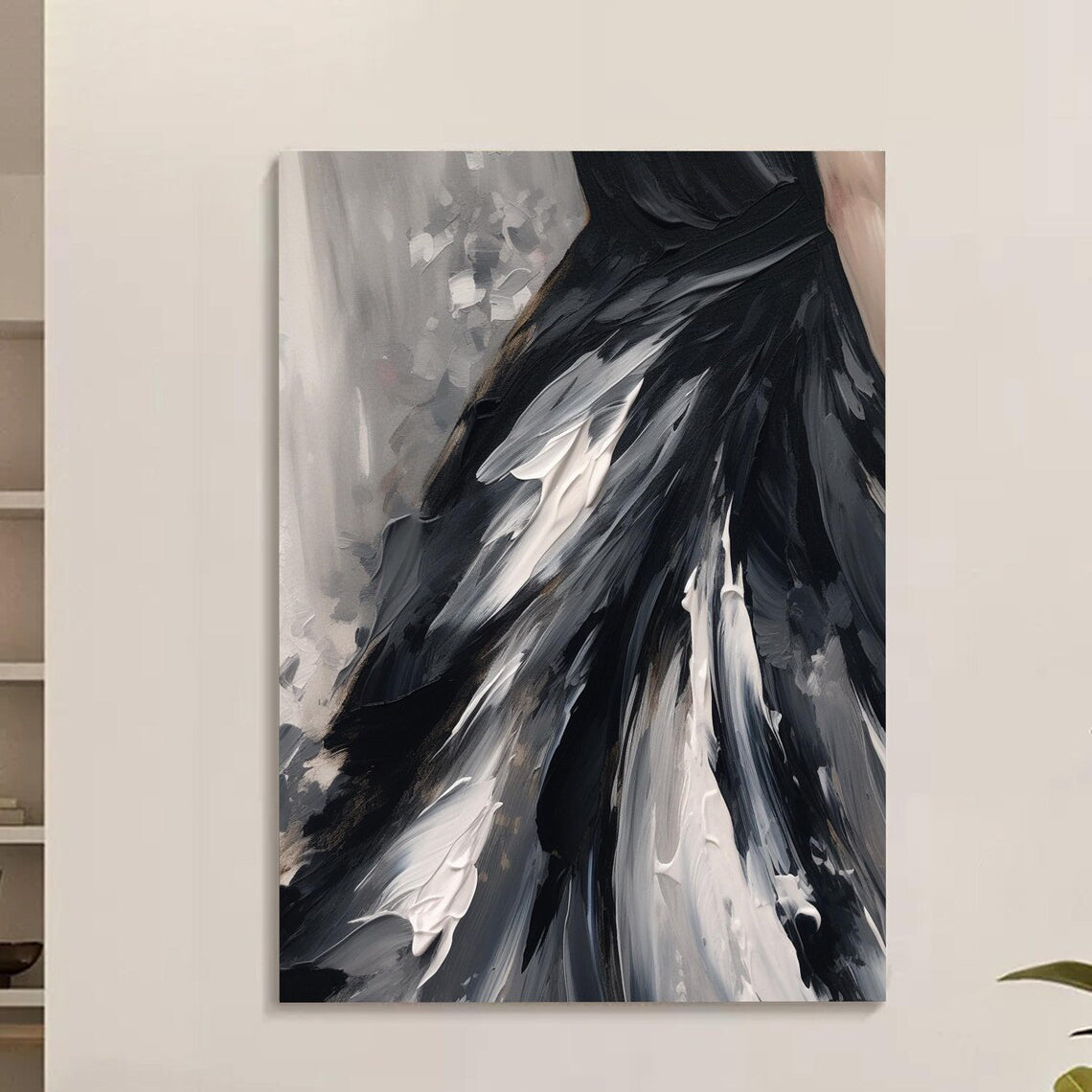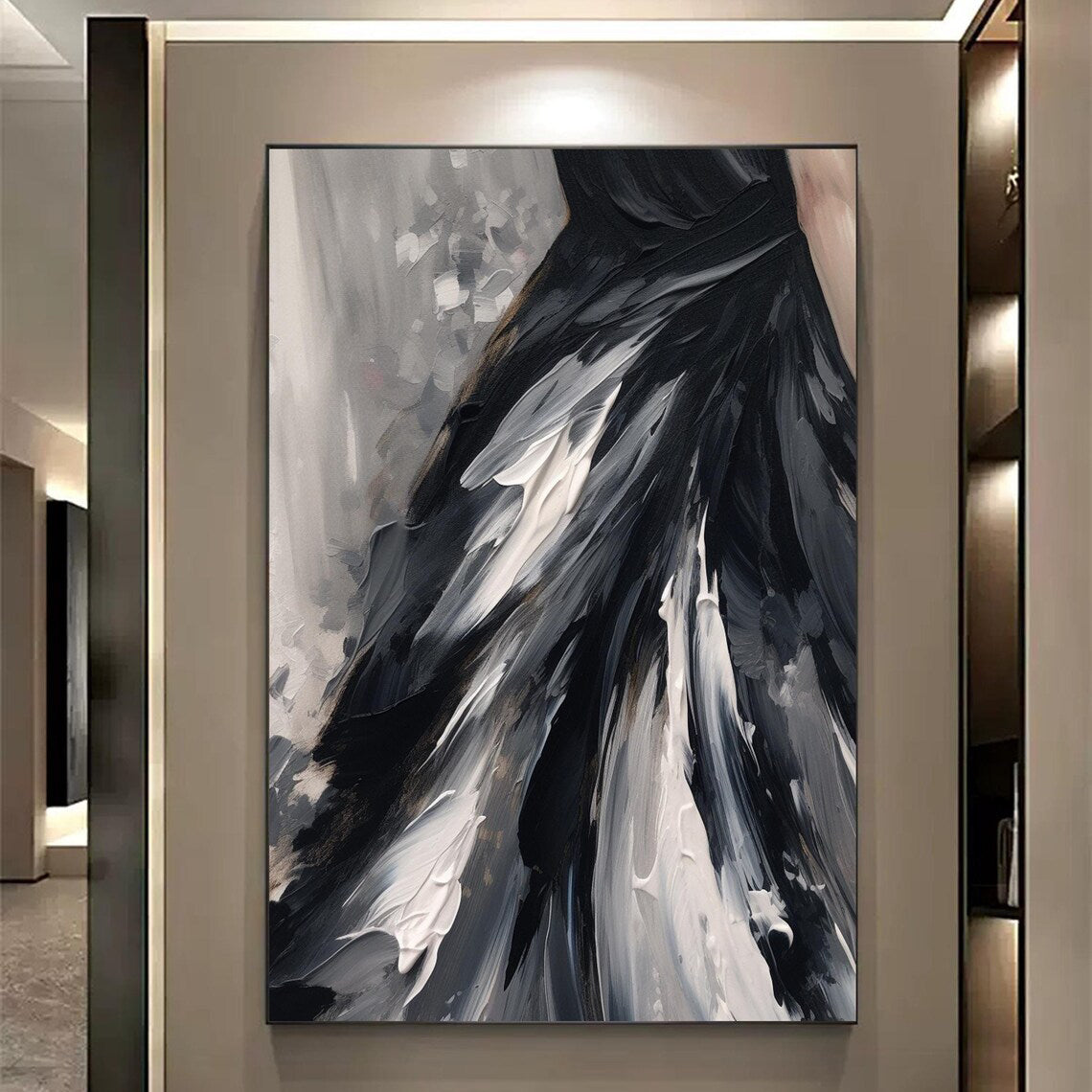 Every stroke in this artwork tells a story of elegance in motion. The rich monochrome palette and fluid lines create a mesmerizing centerpiece that feels like a fashion statement and a timeless work of art combined.