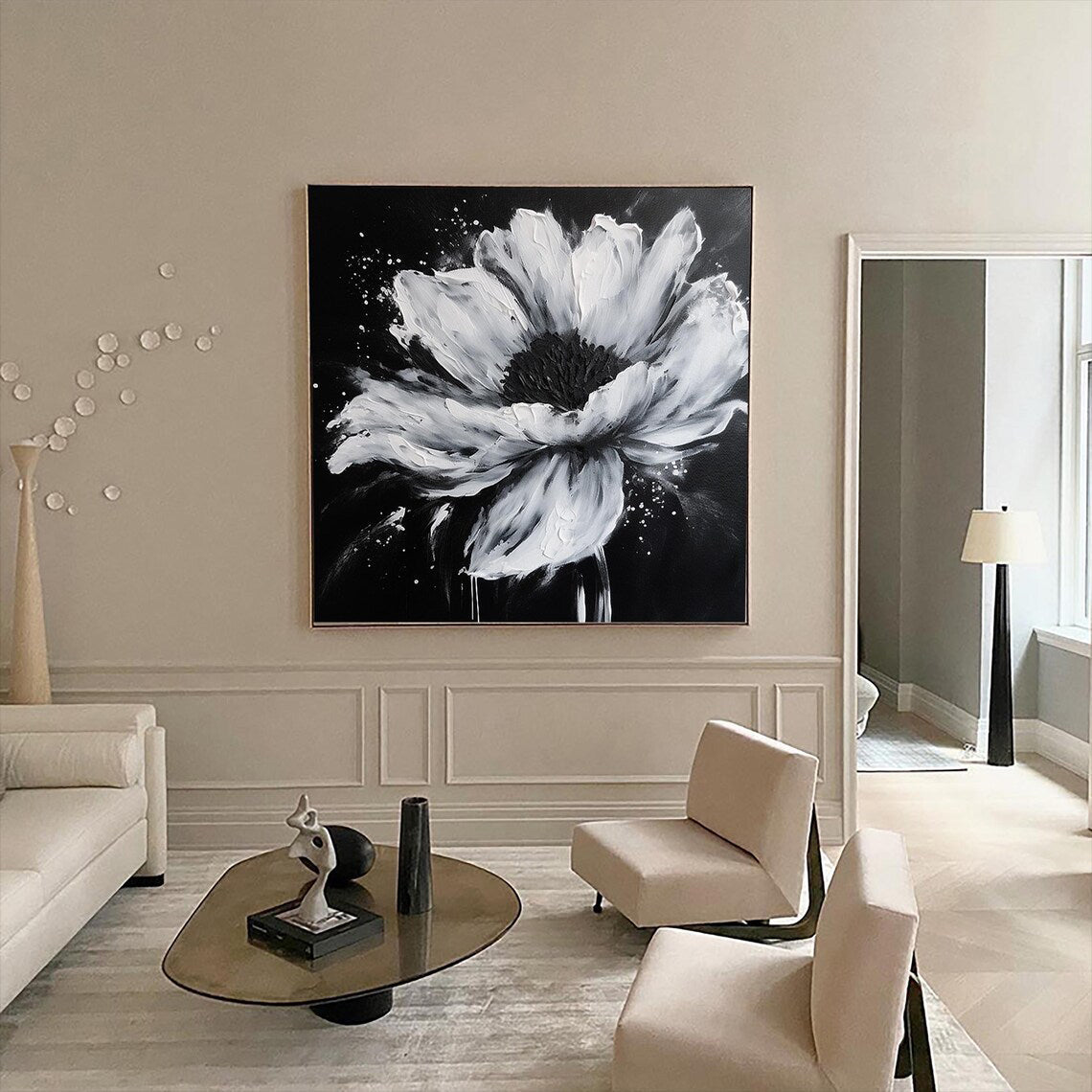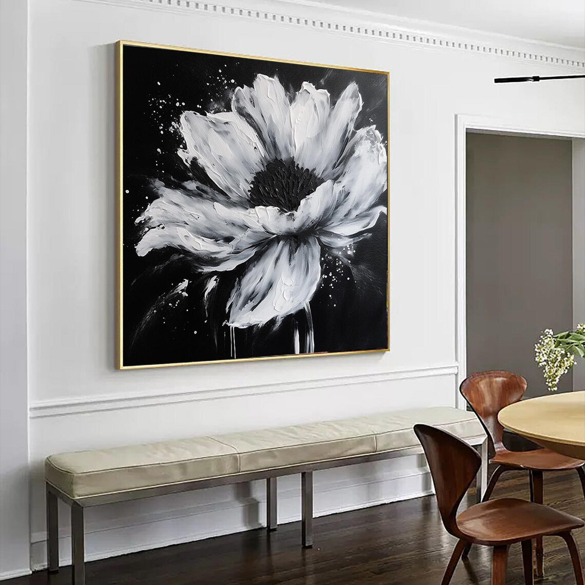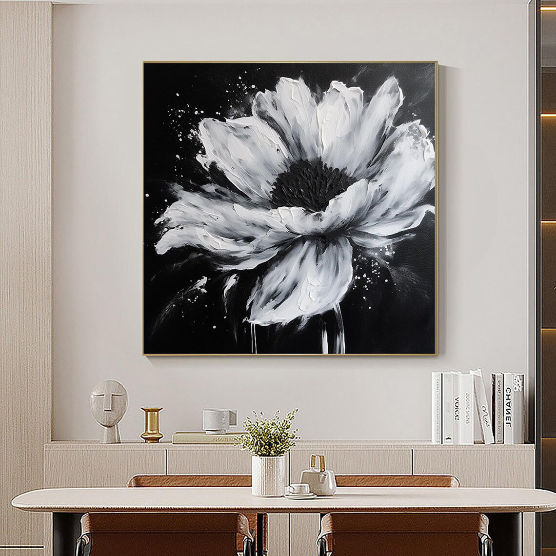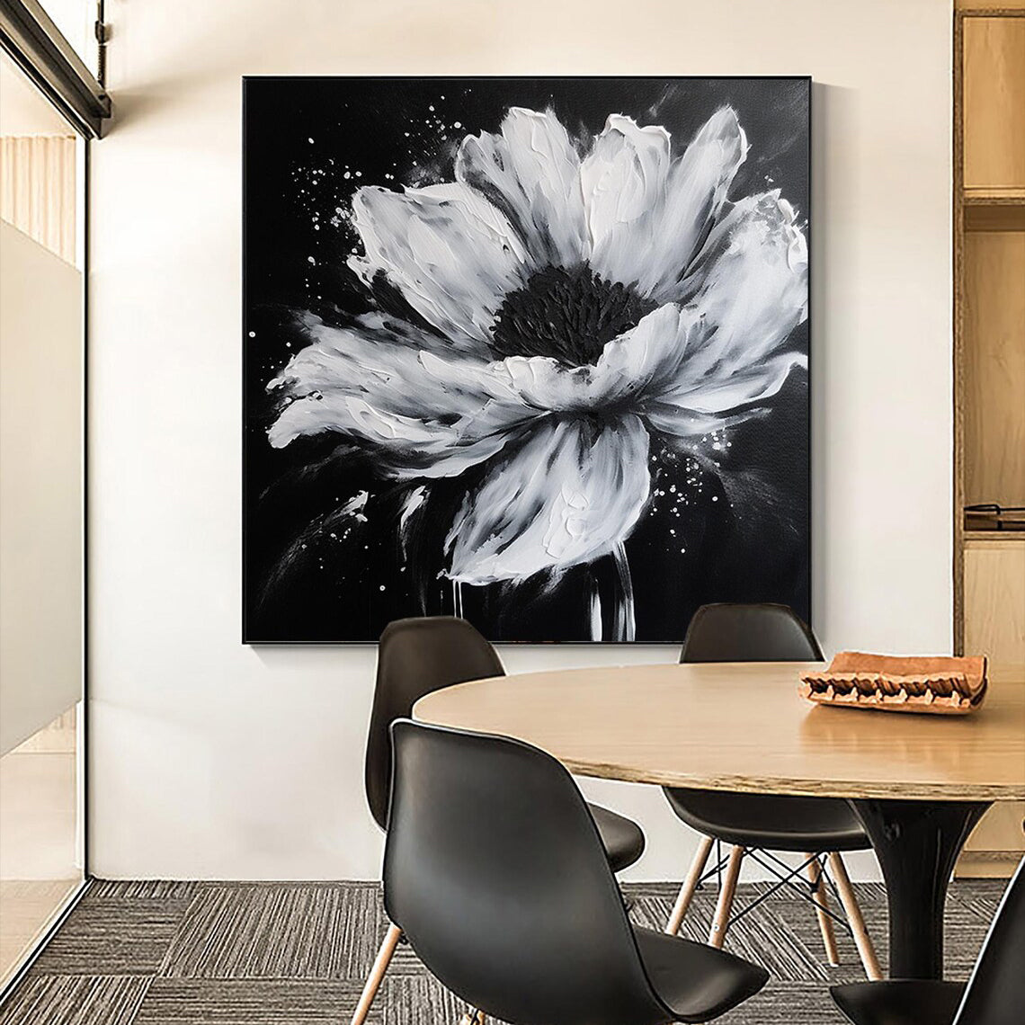 Black and white has never looked so vibrant. This captivating floral artwork combines striking contrasts with textured details, bringing a modern edge to timeless beauty. Let this bold flower add sophistication and drama to your walls.