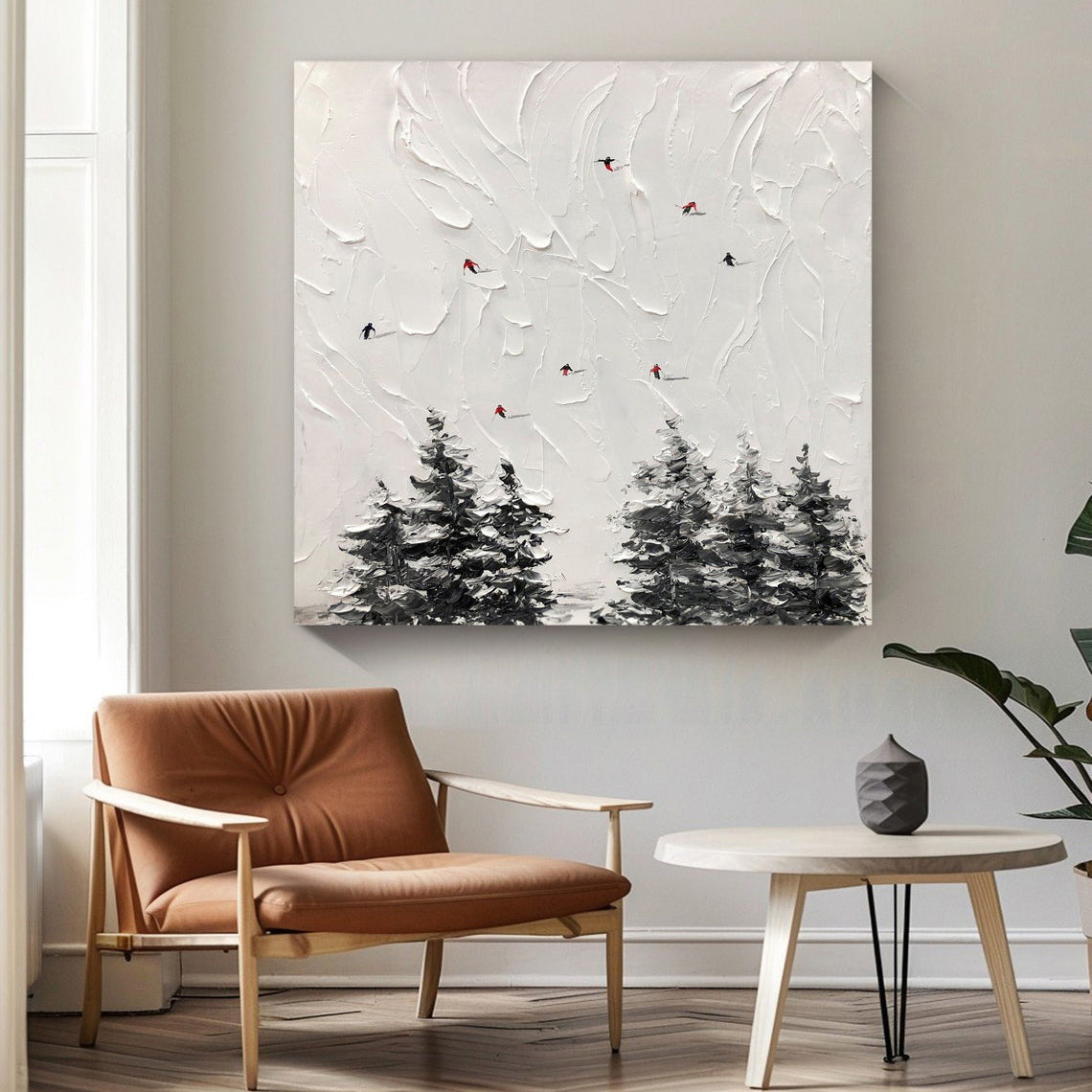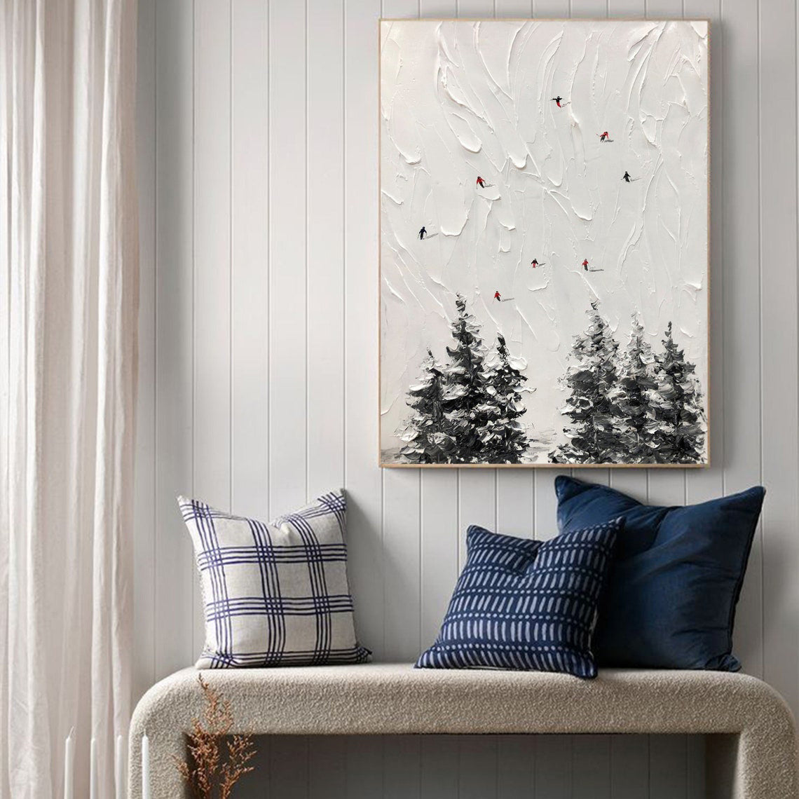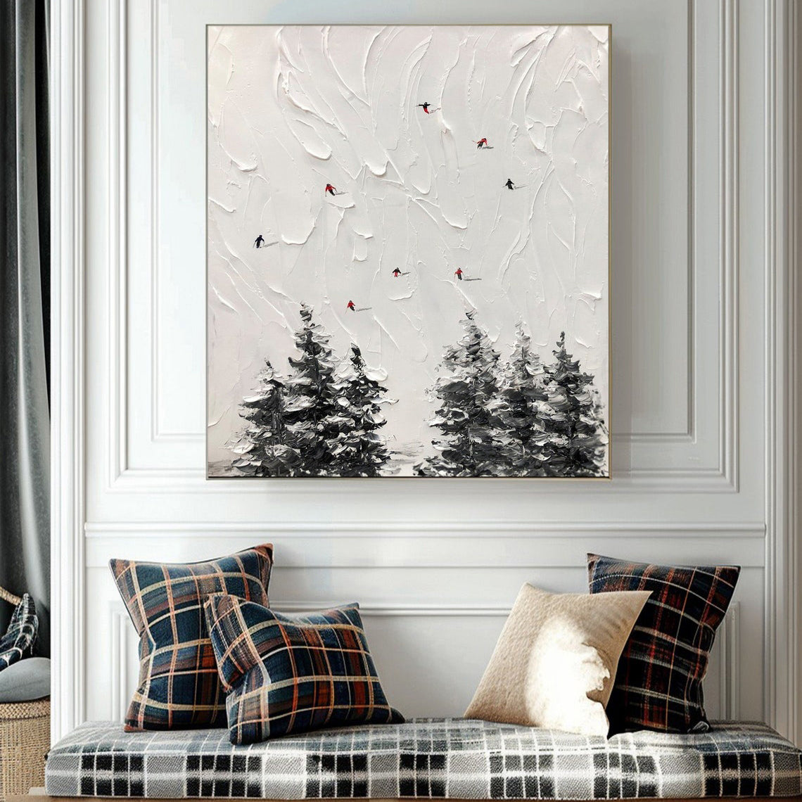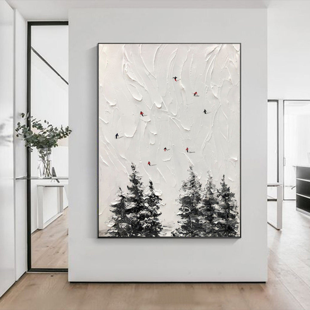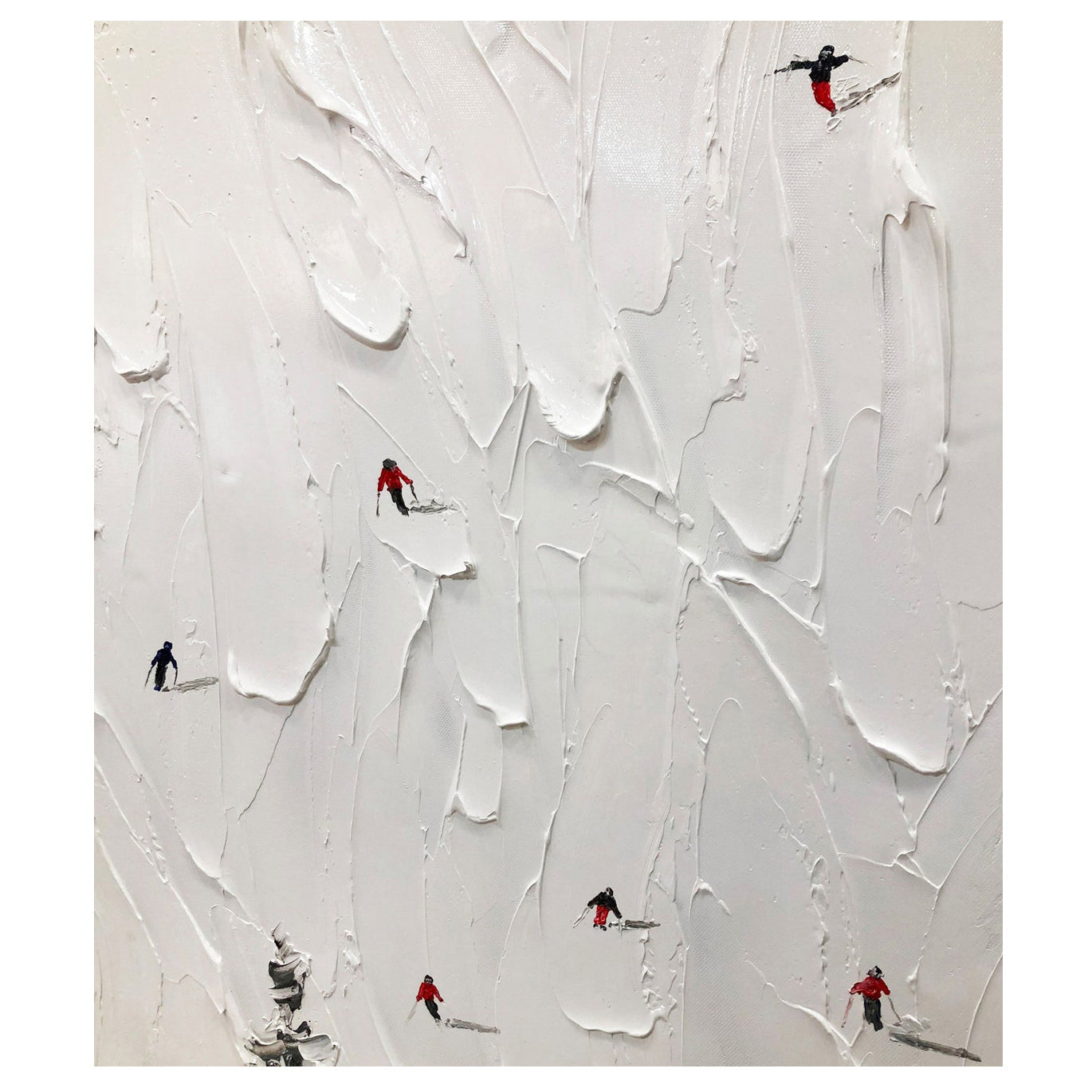 The Steep Slopes captures the thrill of winter adventure! The funny, tiny skiers zigzag across a textured snowy canvas, bringing energy and charm to your walls. This piece will add movement and joy to any space and is perfect for people who love winter sports!