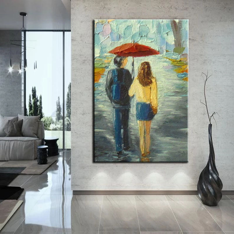 There’s something special about sharing an umbrella on a rainy day, and this painting captures that moment perfectly. The gentle brushstrokes and serene scene make it an ideal piece for those who love the simple pleasures in life.