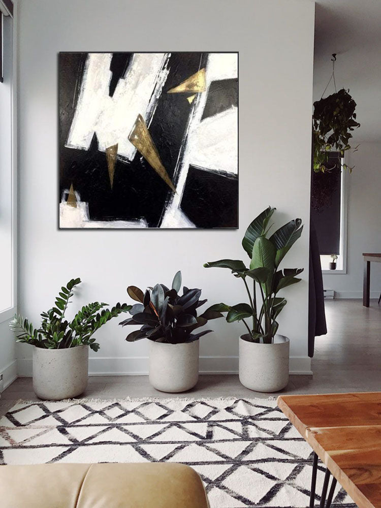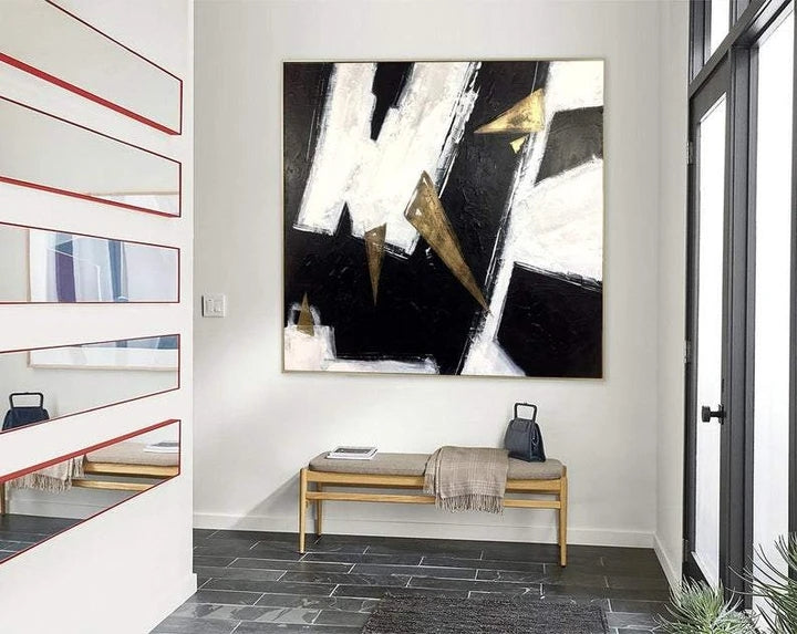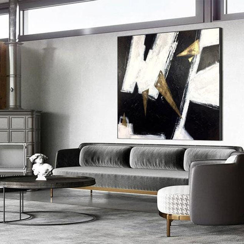 Ventura, meaning 'Future' in Latin, is a modern, black-and-white art piece that features beautiful golden details. It's a gorgeous abstract painting that will add a dynamic and sophisticated style to any type of home interior. ⁠