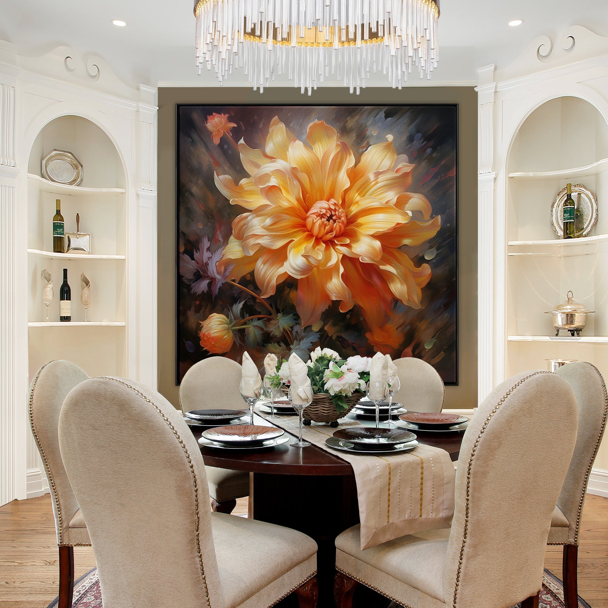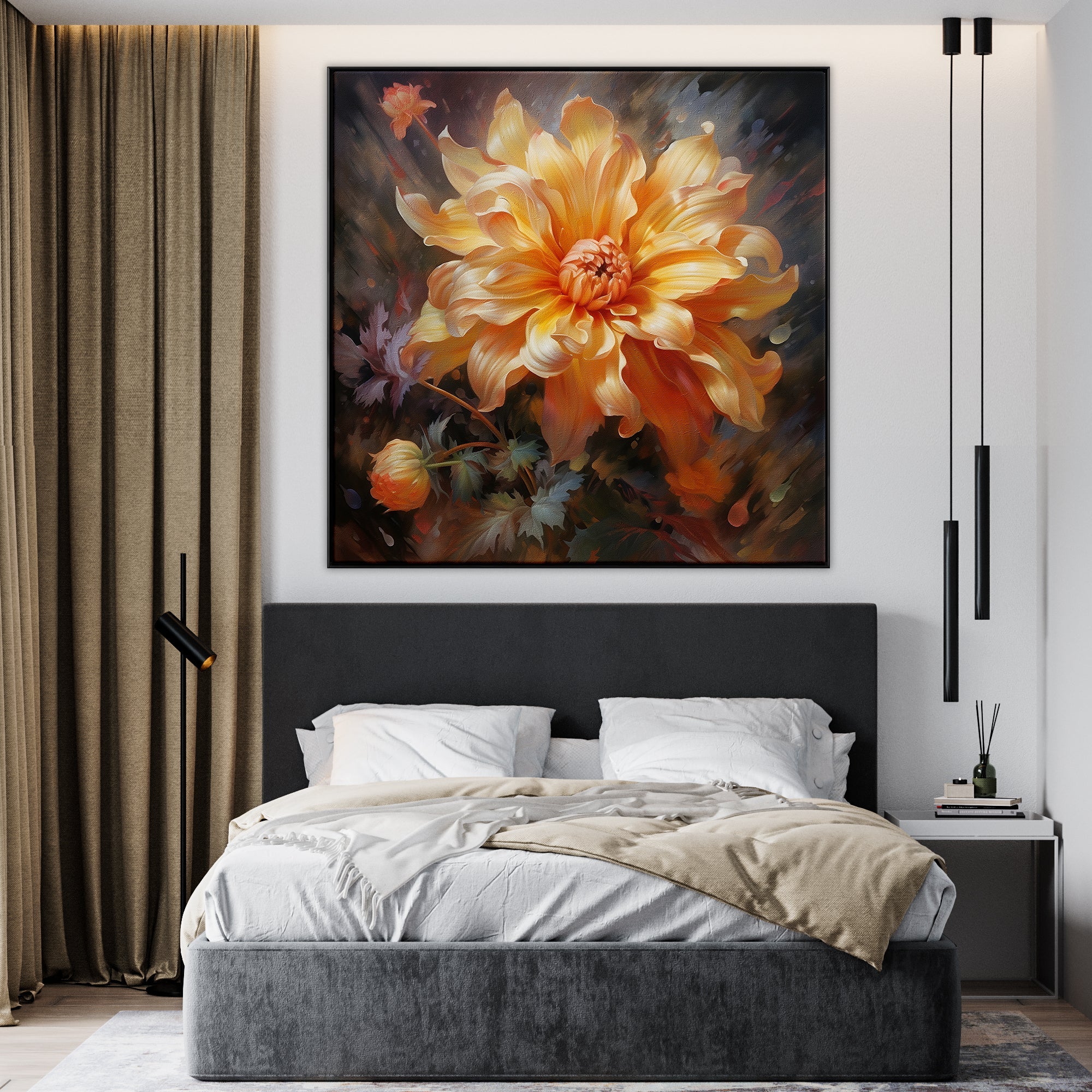 In "Versilla," a radiant orange flower takes center stage, kissed by the sun's glow. The exquisite realism-style and radiating warmth of this artwork make it a vibrant addition to any space or room.