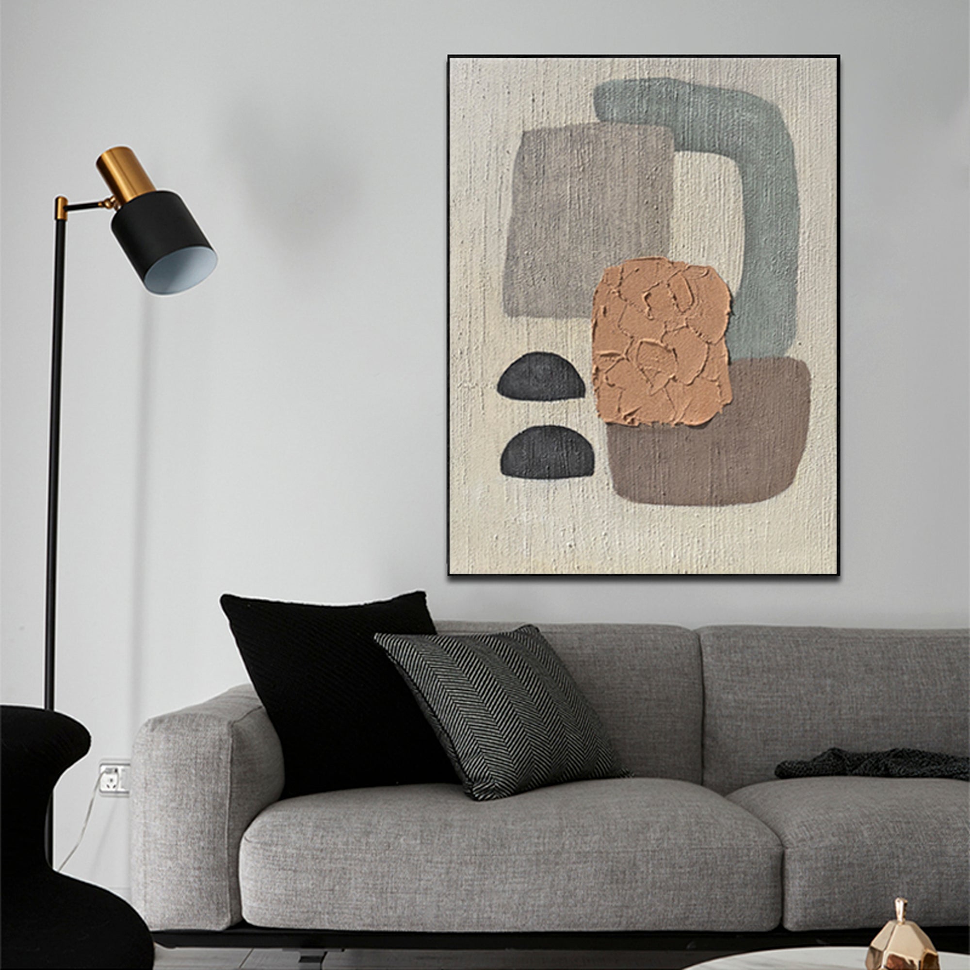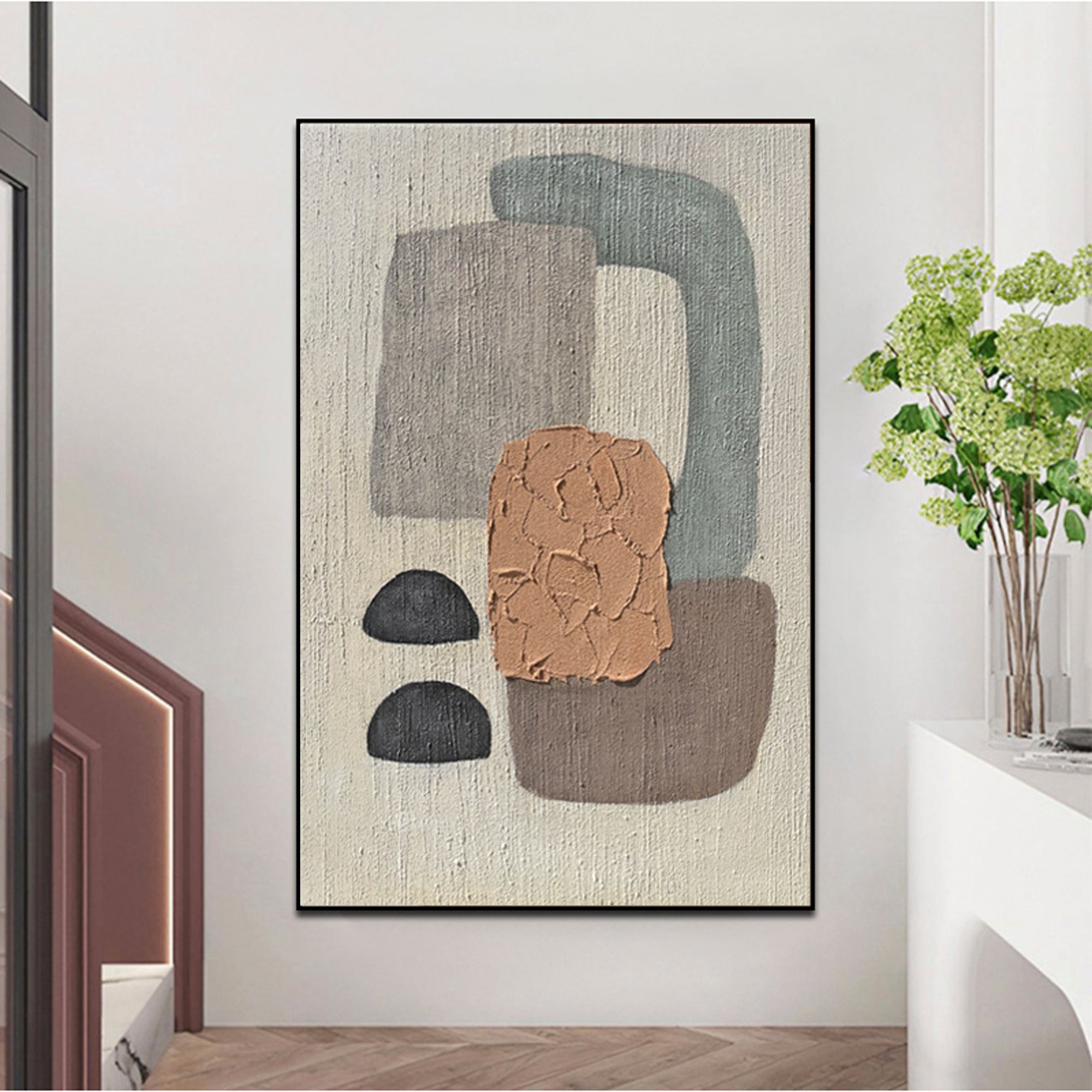 A unique artwork all in harmony with itself'. This artwork 'Concords' tells a story of different colored shapes all balancing together beautifully. Its subtle color palette makes this painting suited for any type of home interior!