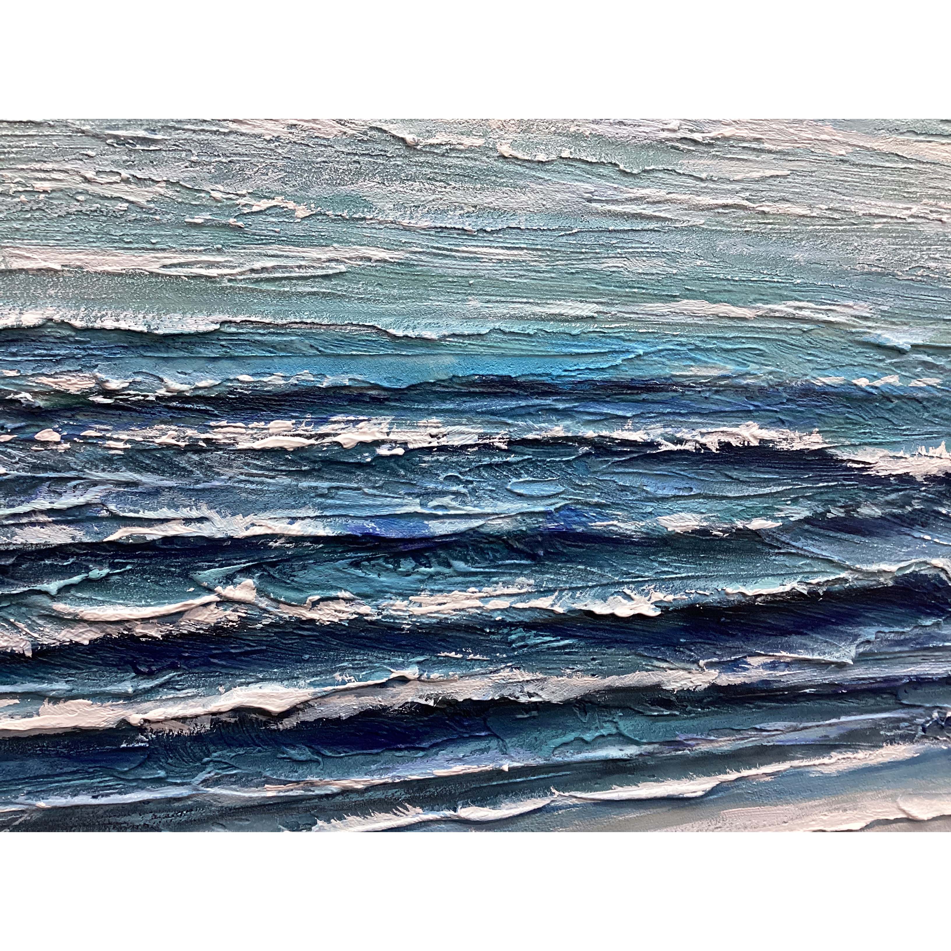 Imagine 'Crystal Blue Shores'—waves crashing in a thick paint dance. It's like a sunny beach day on canvas. Let this painting take you to a coastal escape where art meets the rhythmic dance of the sea.