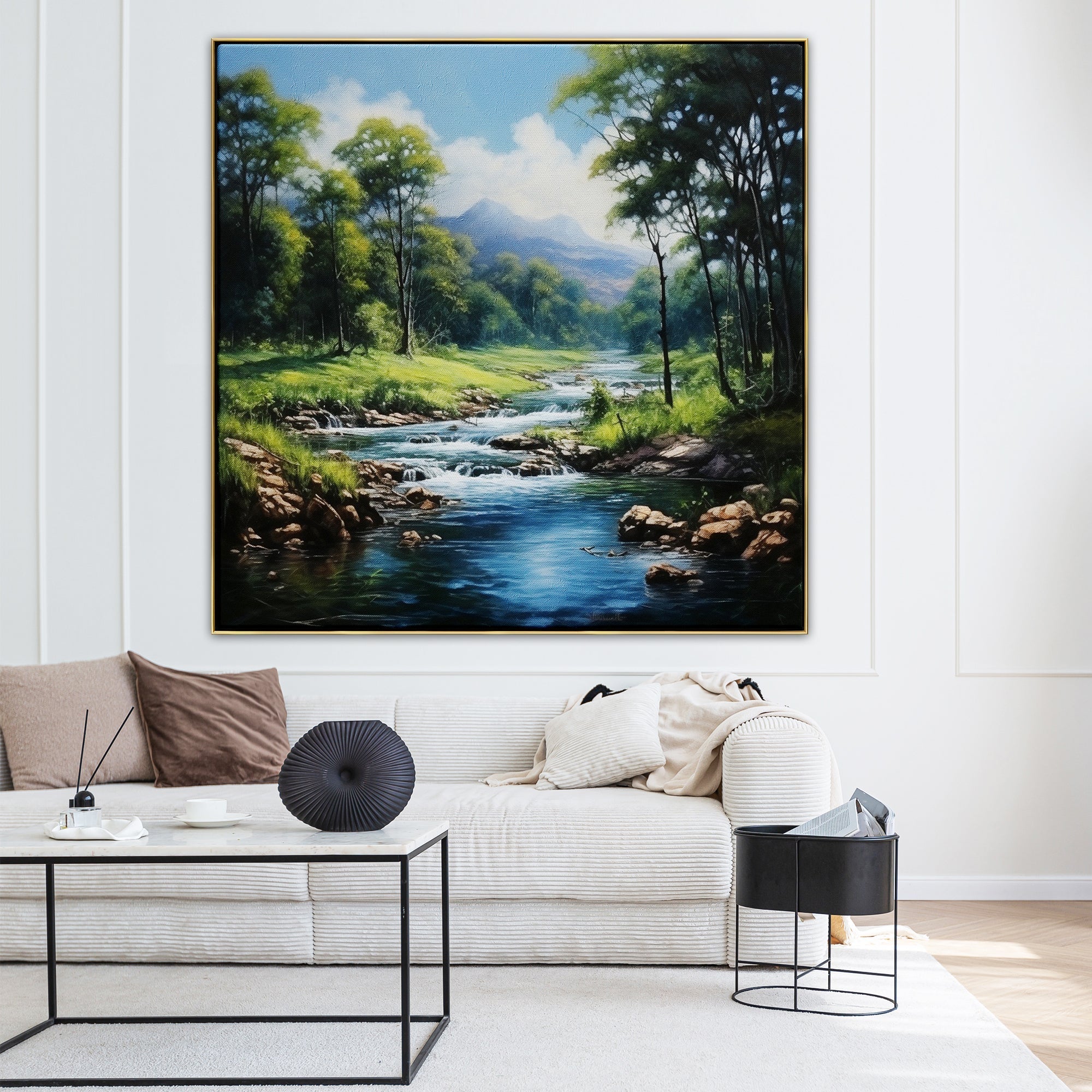 In 'Engelberg', the enchanting landscape captures the serene beauty of a lush valley. The river's gentle flow weaves through towering trees, offering a tranquil escape into nature's embrace for any space.