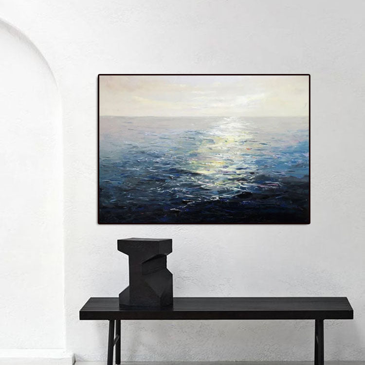 Glittering sunlight reflecting beautifully on the dark, blue sea... What a sight to behold! This fantastic realism artwork portrays the astonishing beauty of an idyllic ocean sunrise! Its realistic color scheme makes this piece suited for many types of home interiors! ⁠