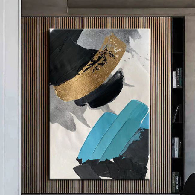 Reverie" captivates with its striking interplay of gold, black, and turquoise. This unique abstract piece adds a touch of refined elegance and mystery to any space. Ideal for modern interiors, it sparks joy and imagination, transforming your space into a gallery of inspiration.