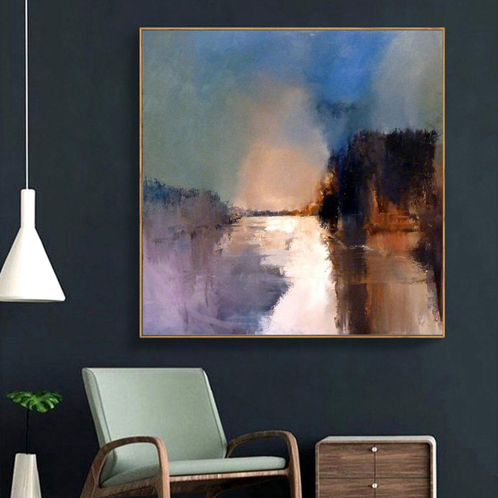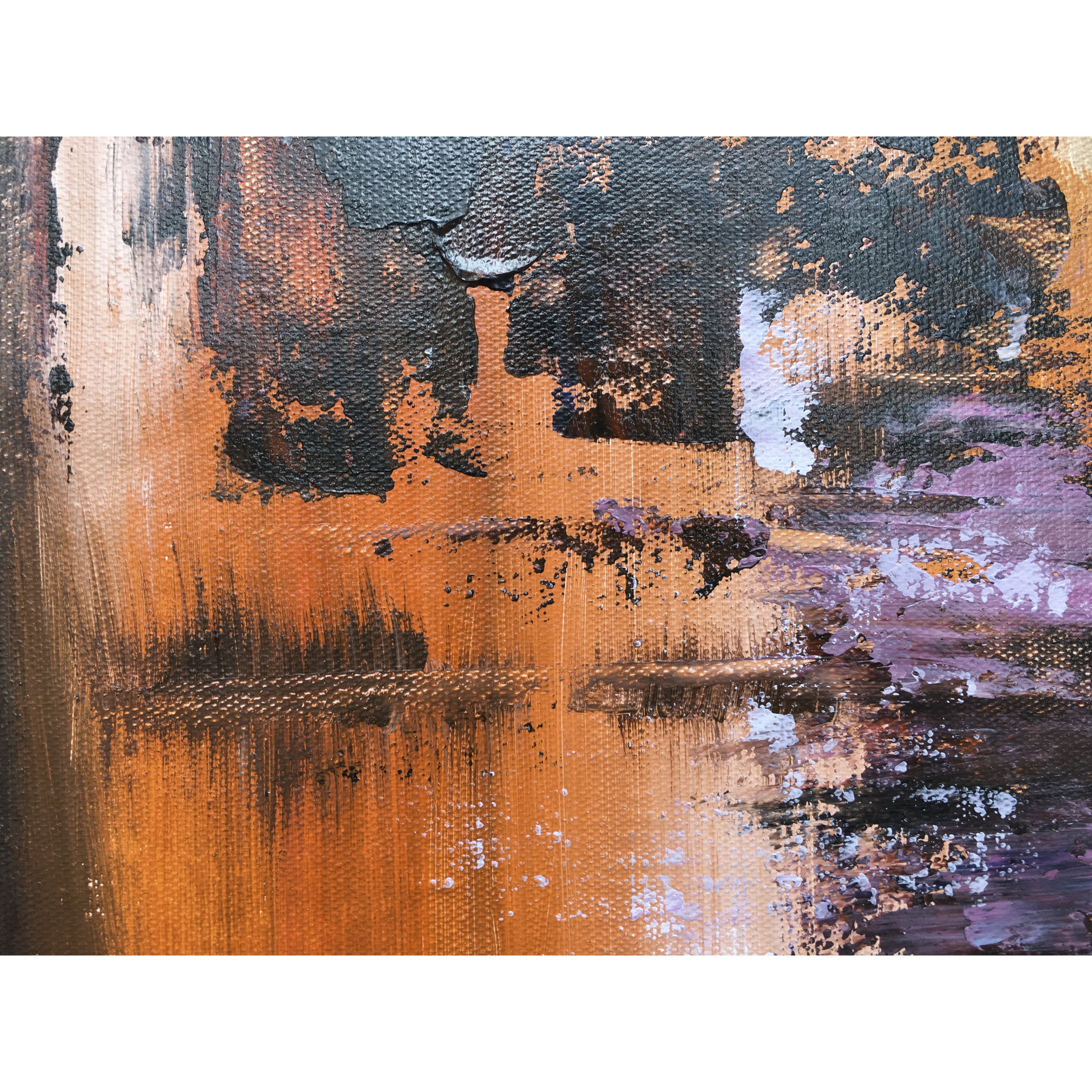 Lose yourself in this beautiful abstract sunset stream! With the use of unusual colours like purple, orange and green, the artist still managed to capture a convincing, romantic setting. The water feels like you could almost touch it, sparkling reflecting on the setting sun.