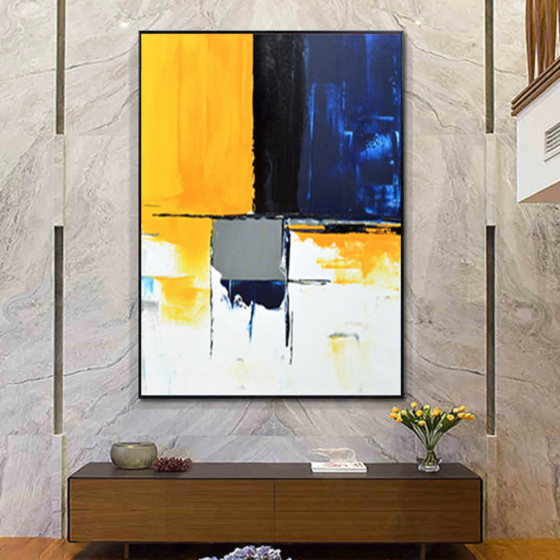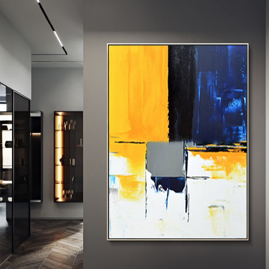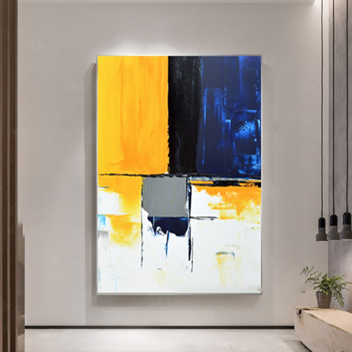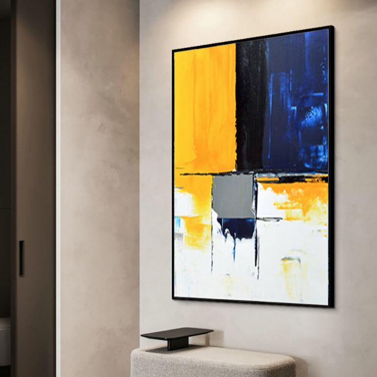 "Take a Seat invites you to sit back and enjoy its bold color palette. The striking contrast of yellow, blue, and black creates a dynamic visual experience, perfect for creating a modern elegance.