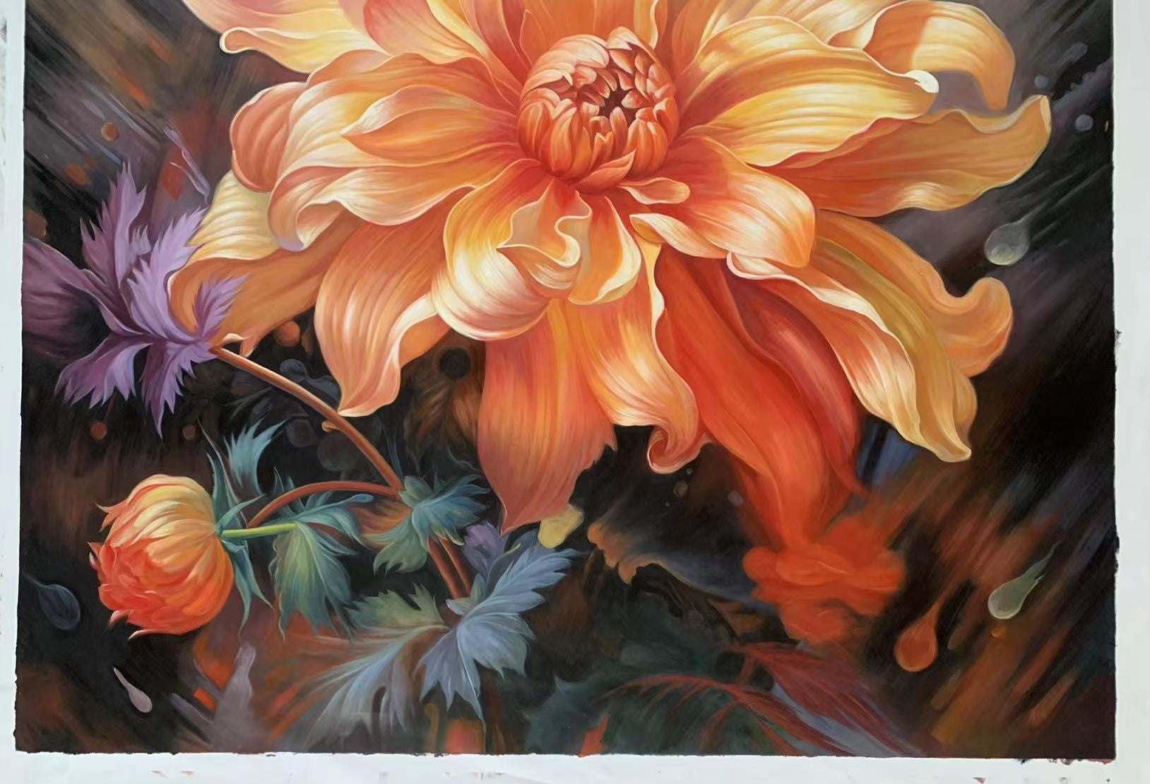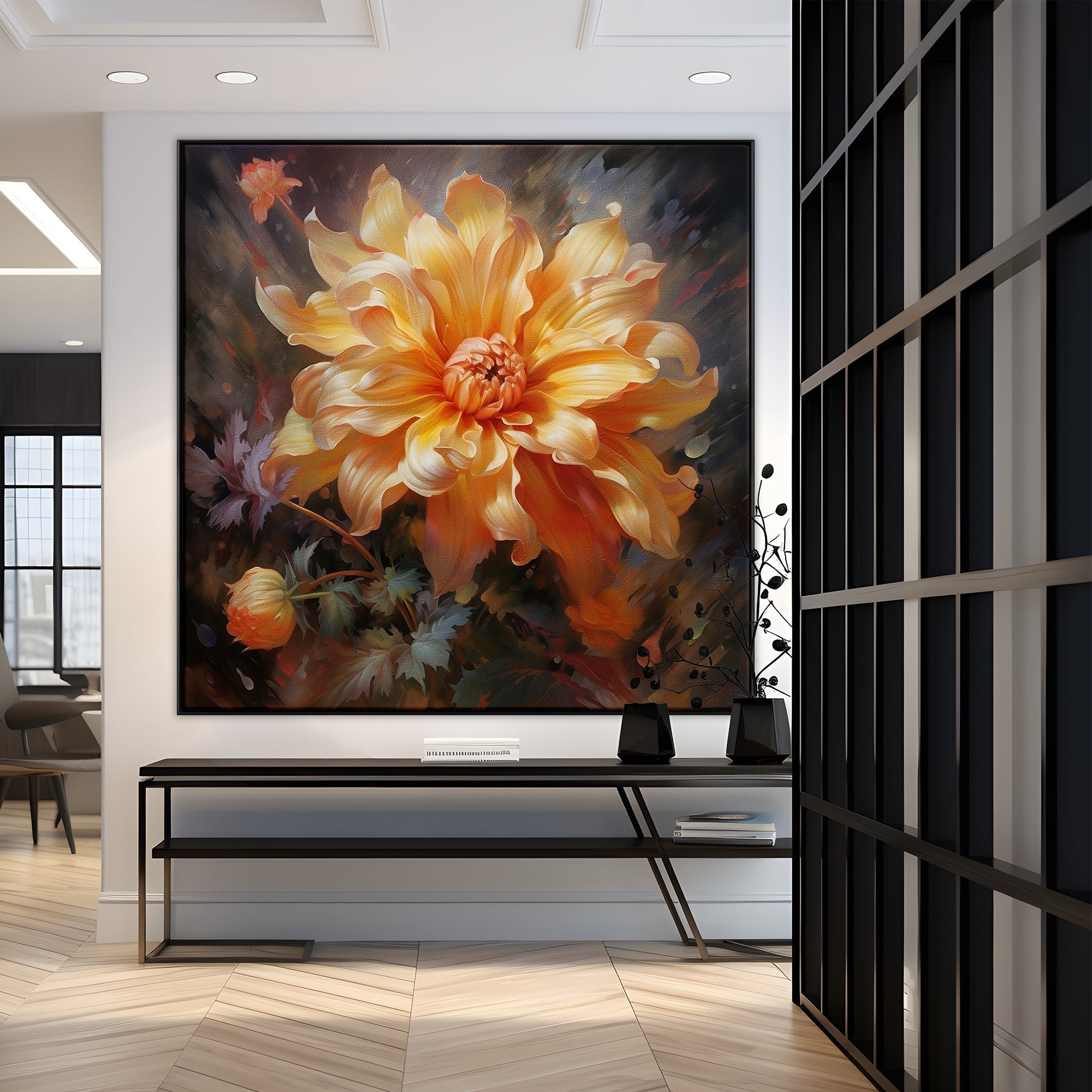 In "Versilla," a radiant orange flower takes center stage, kissed by the sun's glow. The exquisite realism-style and radiating warmth of this artwork make it a vibrant addition to any space or room.