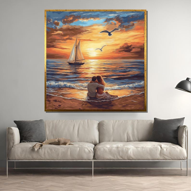 There's nothing like Watching the Sunset with someone special. This painting captures that quiet, perfect moment. With a beautiful glow and gentle waves, this piece brings a touch of romance and calm to any type of home interior!