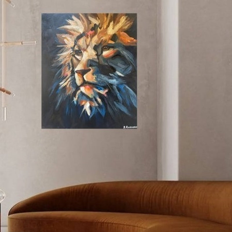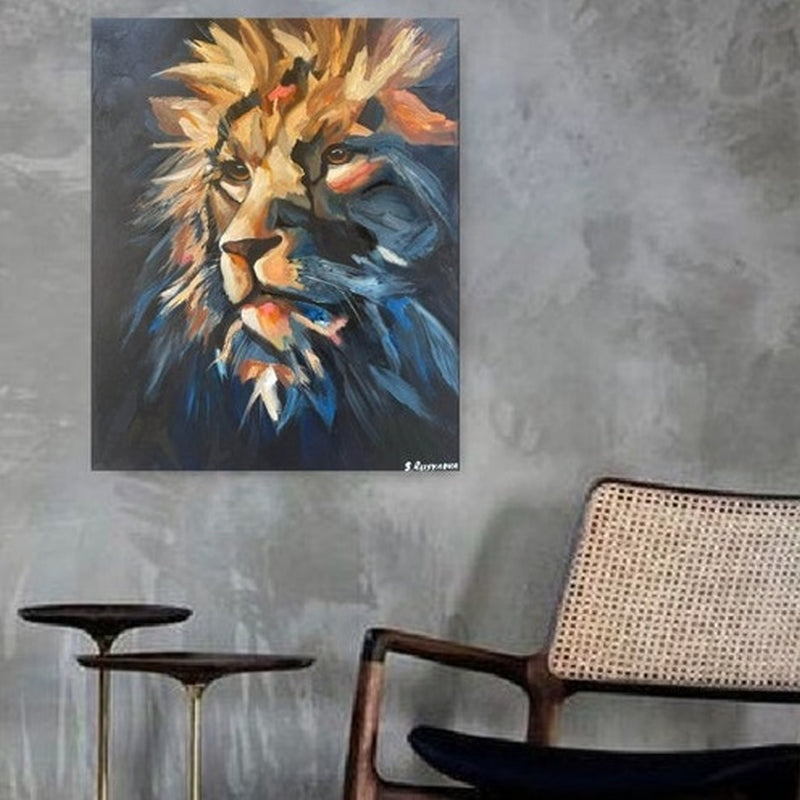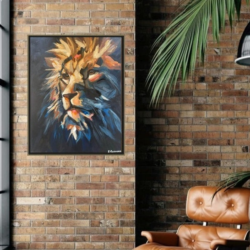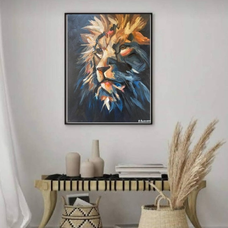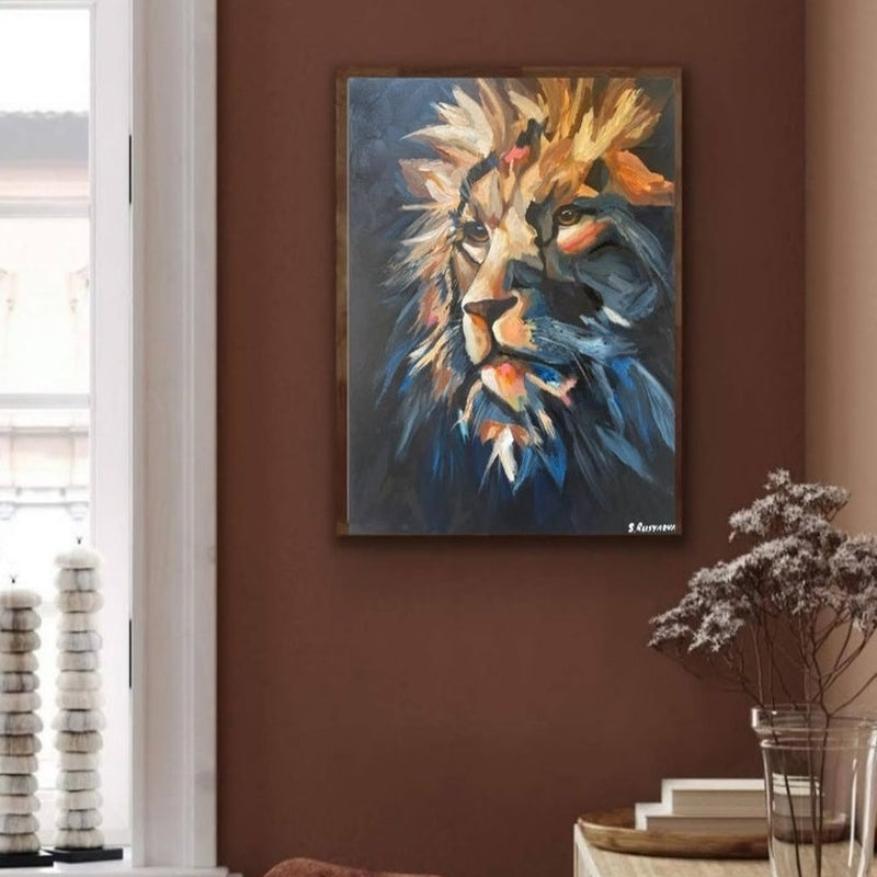 We'd like you to meet the true king of the jungle, Zarina! His friendly eyes show a lifetime of experience and leadership. With just a few brushstrokes his mighty manes are portrayed majestically, making it a beautiful addition to any home interior!